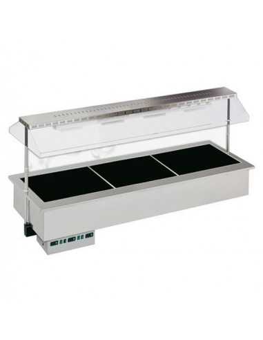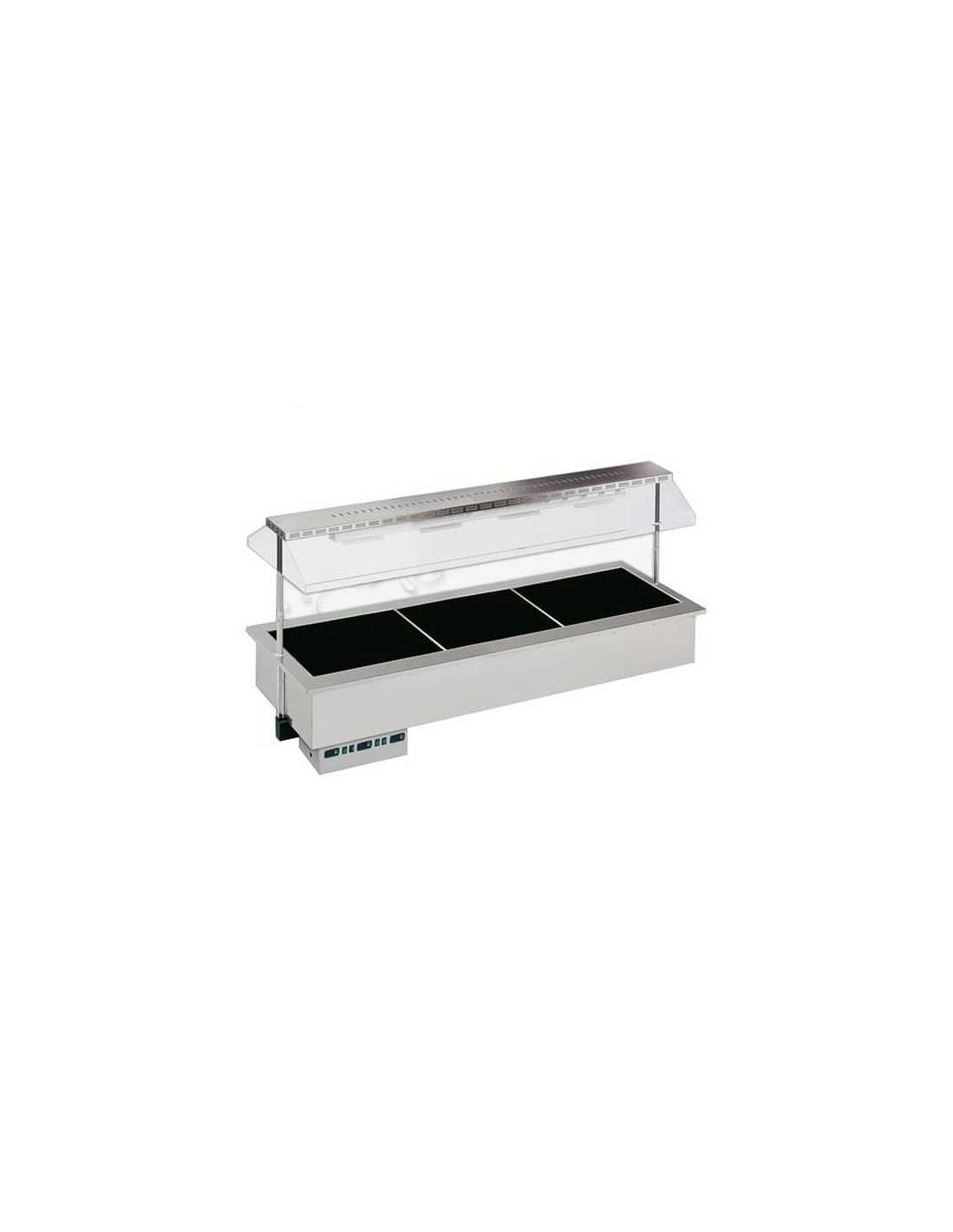 Heated recessed exposition tank with glassceramic plates - Model SINFONIA HOT - Temperature +30°/90°C - Power w 1800 plates - Power w heating lamps 4 x 300 - Power total W 2900 - Single-phase power supply V230/1/50Hz - Dimensions cm 206.2x74.9x100.5 h