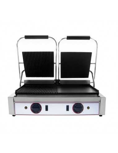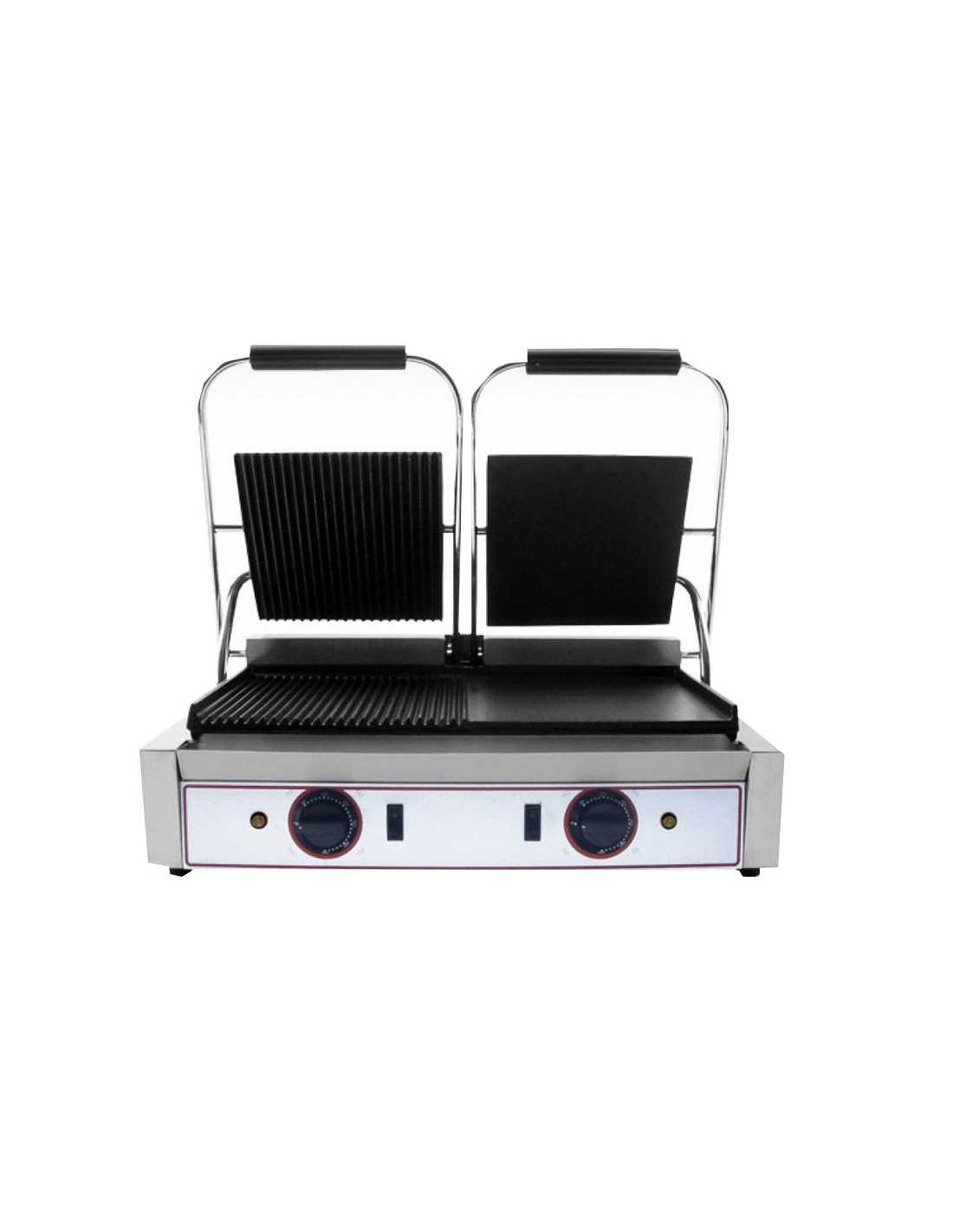 Cooking plate - Panini plate - ModelR2L2 - Right flax - Left-hand row - Temperature + 50 / + 300 ° C - Stainless steel frame - Single-phase feeding - Double separate thermostat - Dimensions cm 56,5 x 31 x 22 h / 52 (open)