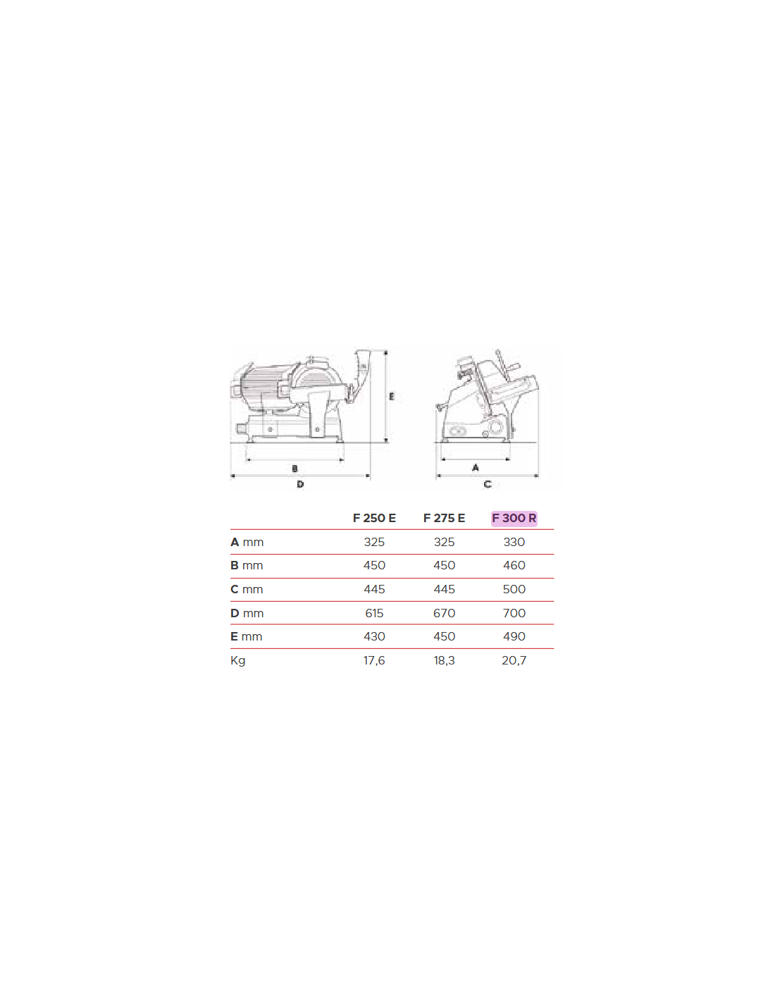 Professional Slicer - Model F 300R - Blade ø 300 mm - Cutting thickness mm 0 ÷ 16 - Useful cut mm 200 x 215 - Fixed sharpener - Power 0.33 HP / 0.220 kW - Power supply single-phase V220/1/50Hz - Dimensions cm 49 × 70 × 50 h
