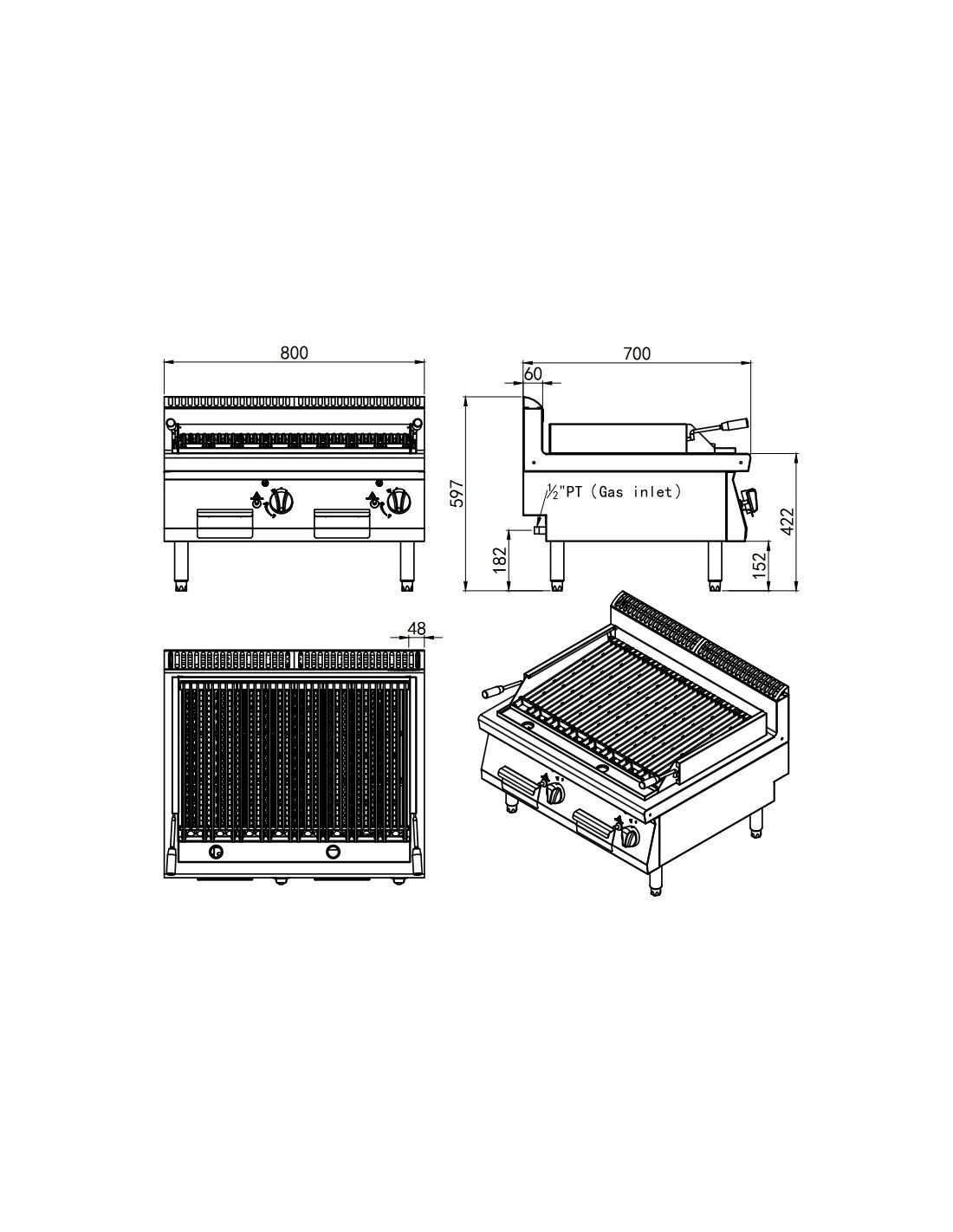 Lava stone grill - Model AT8G9CM-C - Gas supply - AISI 430 stainless steel structure - AISI 304 stainless steel grill - Power 2 x kW 7 - Dimensions cm 80 x 70 x 54.7 h