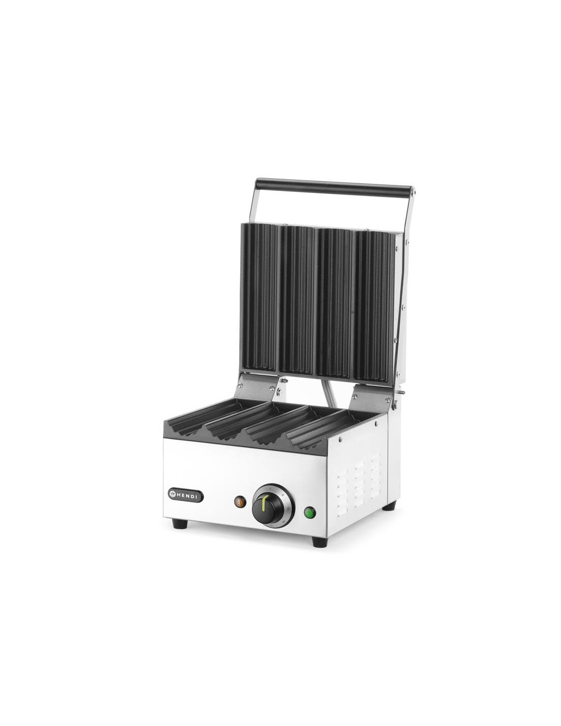 It features 4 grilling slots, indicator lights, a 270 x 250 mm grill surface and non-slip feet, making it suitable for efficient hot dog or sandwich preparation in commercial settings | |