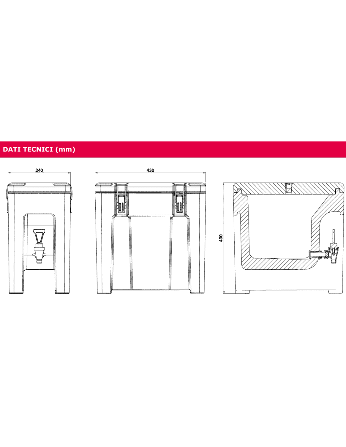 | Internal and external walls of the container and polyethylene lid suitable for food contact, insulating polyurethane between the walls of the container and the cover without CFC and HCFC, gasket with silicone rubber, polyamide and polypropylene faucet, stainless steel closures | |