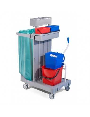 Cleaning trolley - Model CA1615 - Plastic frame and handle - Bucket, medium plastic cassette and cutter - Bag - Two 4lt buckets - A 15 lt bucket - Central compartment with sliding drawer - Wheels - Upper rack not included - Dimensions cm 92 x68 x 124h