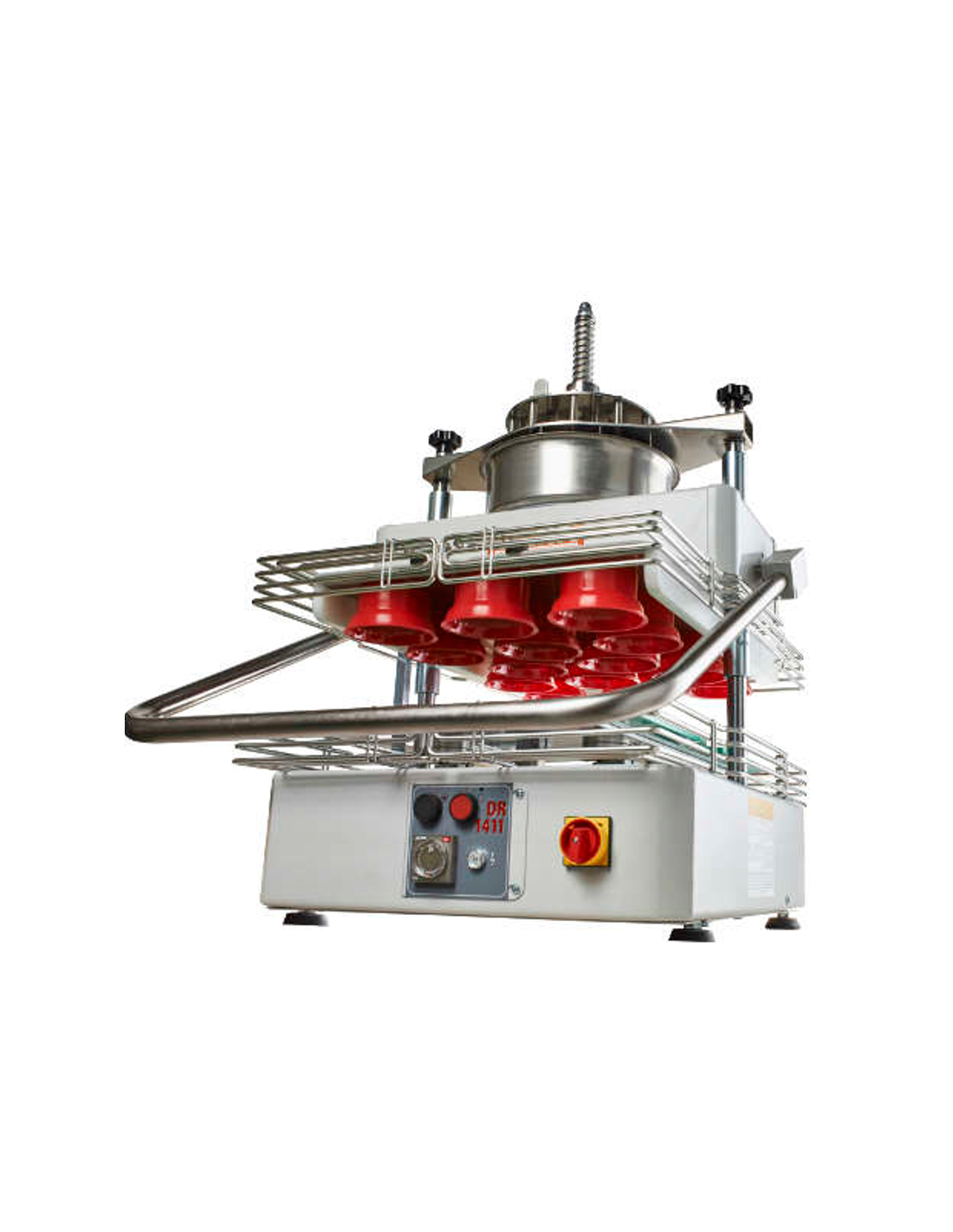 Divider and rounder - Model DR11 - Semi-automatic - Manual cutting - Automatic rounding - 11-piece cutting group - portions/h n.800/1000 - Portions from gr. 300 to gr. 650 - Power kW 0.3 - Dimensions cm 61.8 x 73.6 x 97.3 h