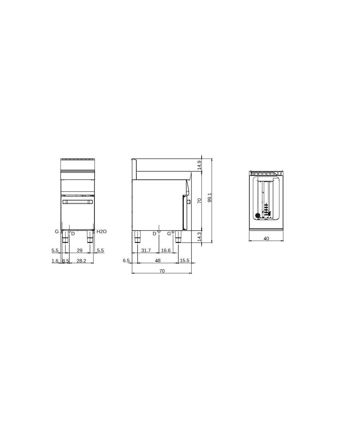 Electric cooker - Model F7040CPG-1V40P - Tank capacity 40 liters - Bath size cm 30.6 x 50.8 x 29.6 h - Water loading tap - Exhaust tap inside the compartment - Power kW 11.8 - Dimensions cm 40 x 70 x 85h
