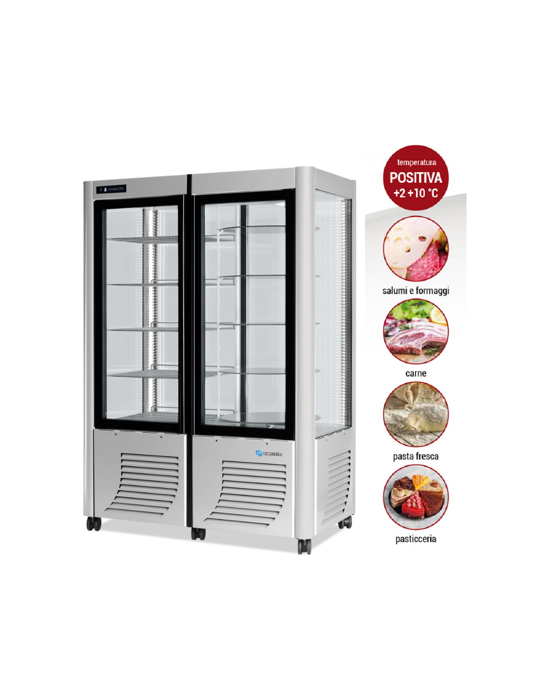 Refrigerated display case - Temperature +2 / +10 °C - Capacity Litres 800 - 4-sided display - Rectangular shelves one side and circular the other - Ventilated refrigeration - LED lighting - Dimensions cm 127 x 70 x 184 h