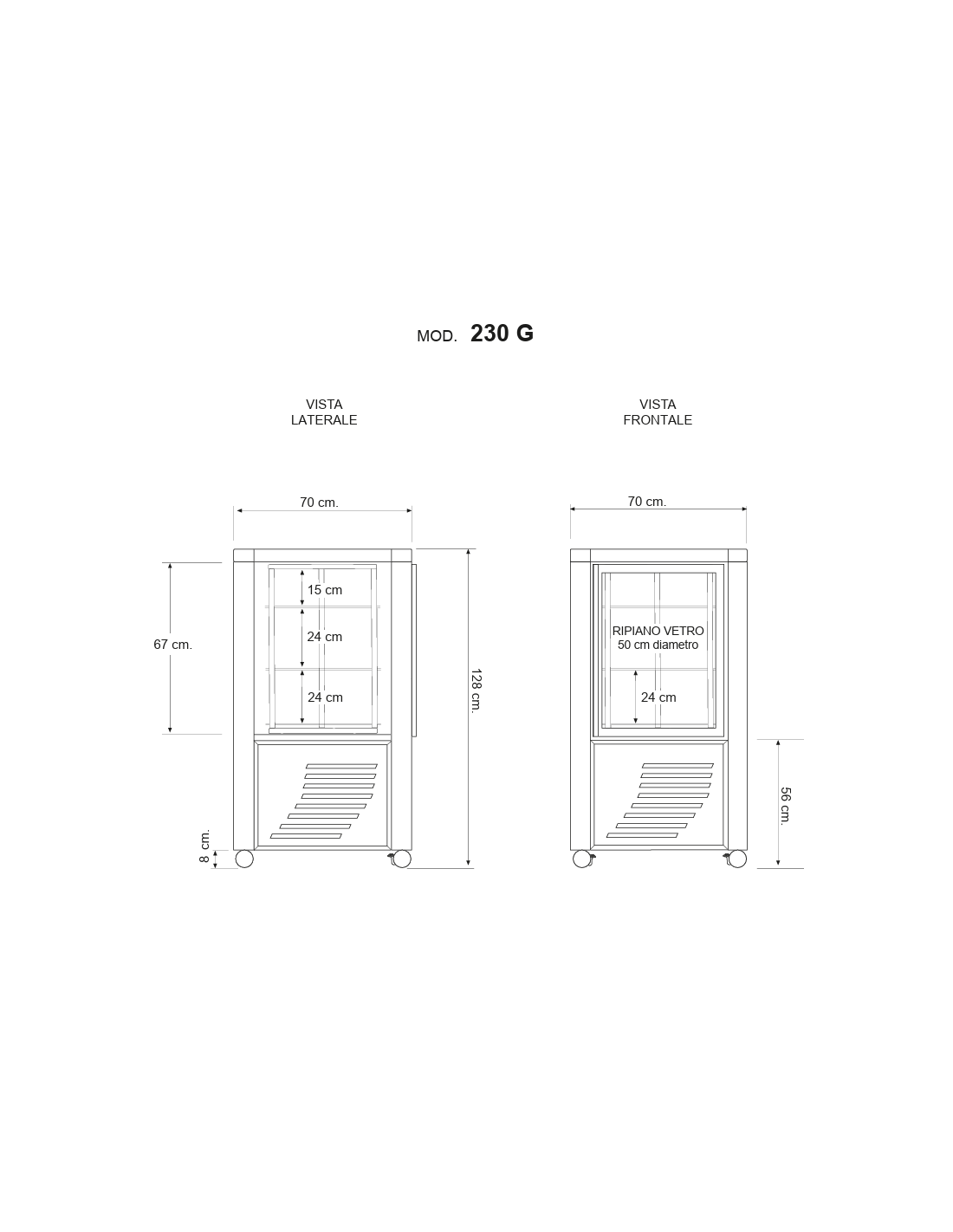 Refrigerated display case - Temperature +2 / +10°C - Capacity Litres 230 - 4-sided display - Circular shelves - Ventilated refrigeration - LED lighting - Dimensions cm 70 x 70 x 128 h