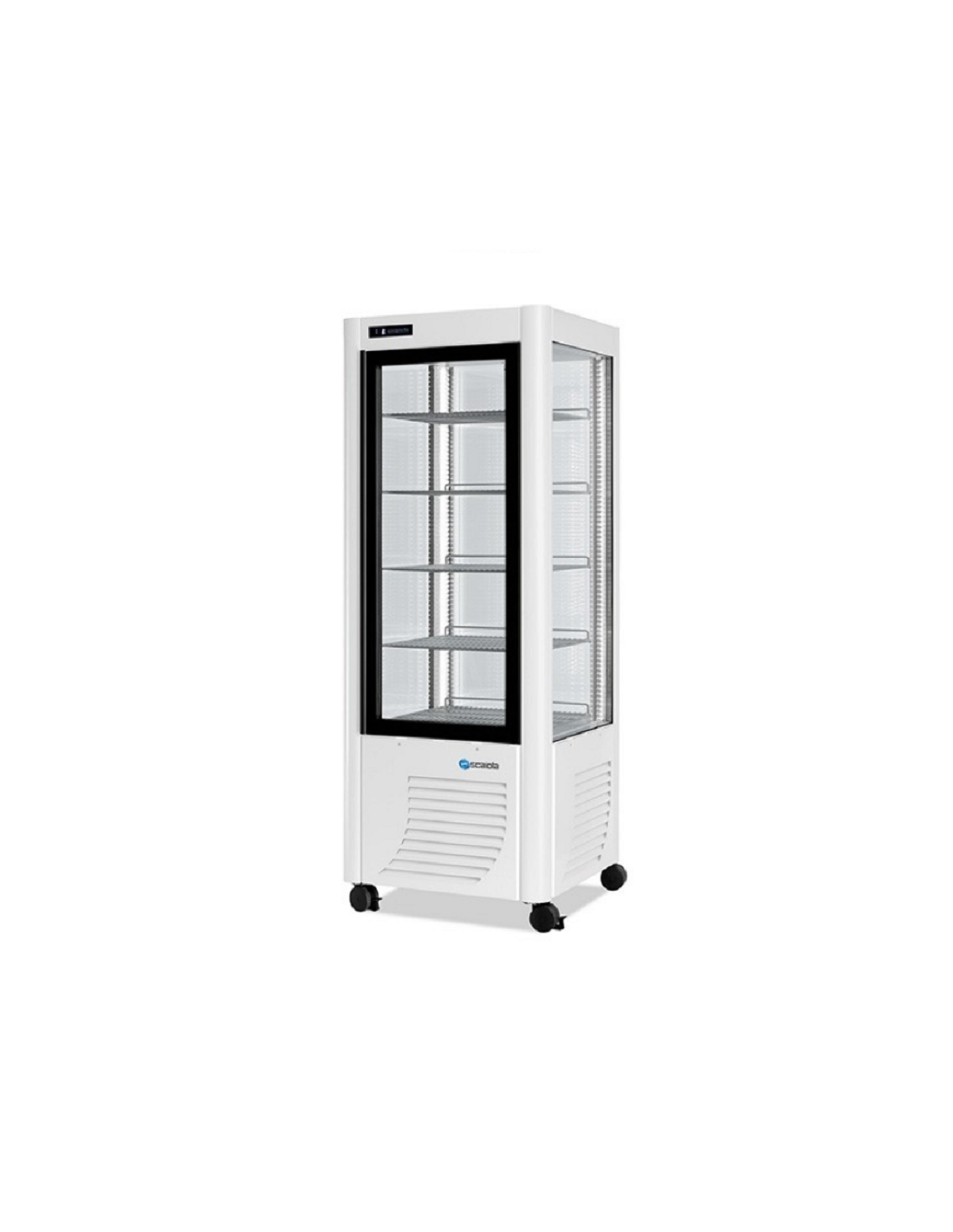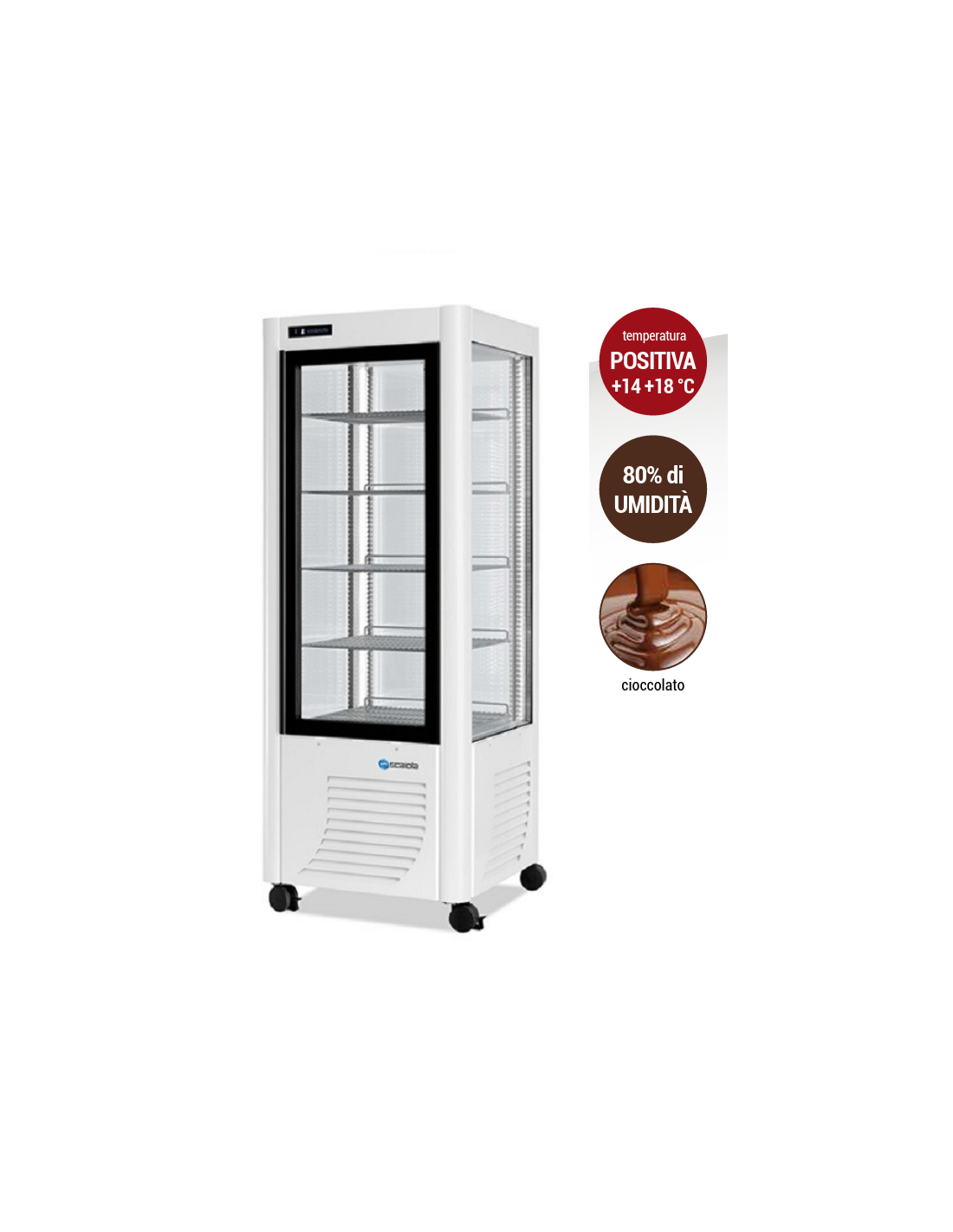 Showcase for Chocolate - Temperature +14/+18 °C - Capacity Litres 400 - Rectangular shelves - 4-sided display - Ventilated refrigeration - Automatic defrost - LED lighting - Dimensions cm 70 x 70 x 184 h