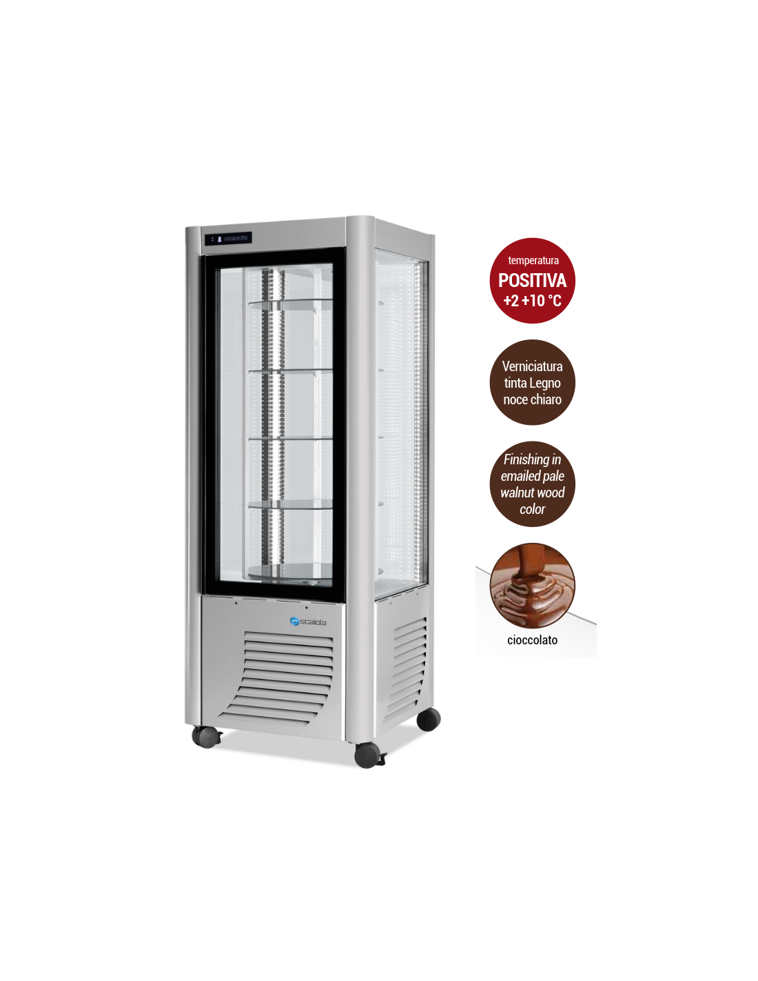 Chocolate display case - Temperature +14/+18 °C - Capacity Litres 400 - Circular shelves - 4-sided display - Ventilated refrigeration - Automatic defrost - LED lighting - Dimensions cm 70 x 70 x 184 h