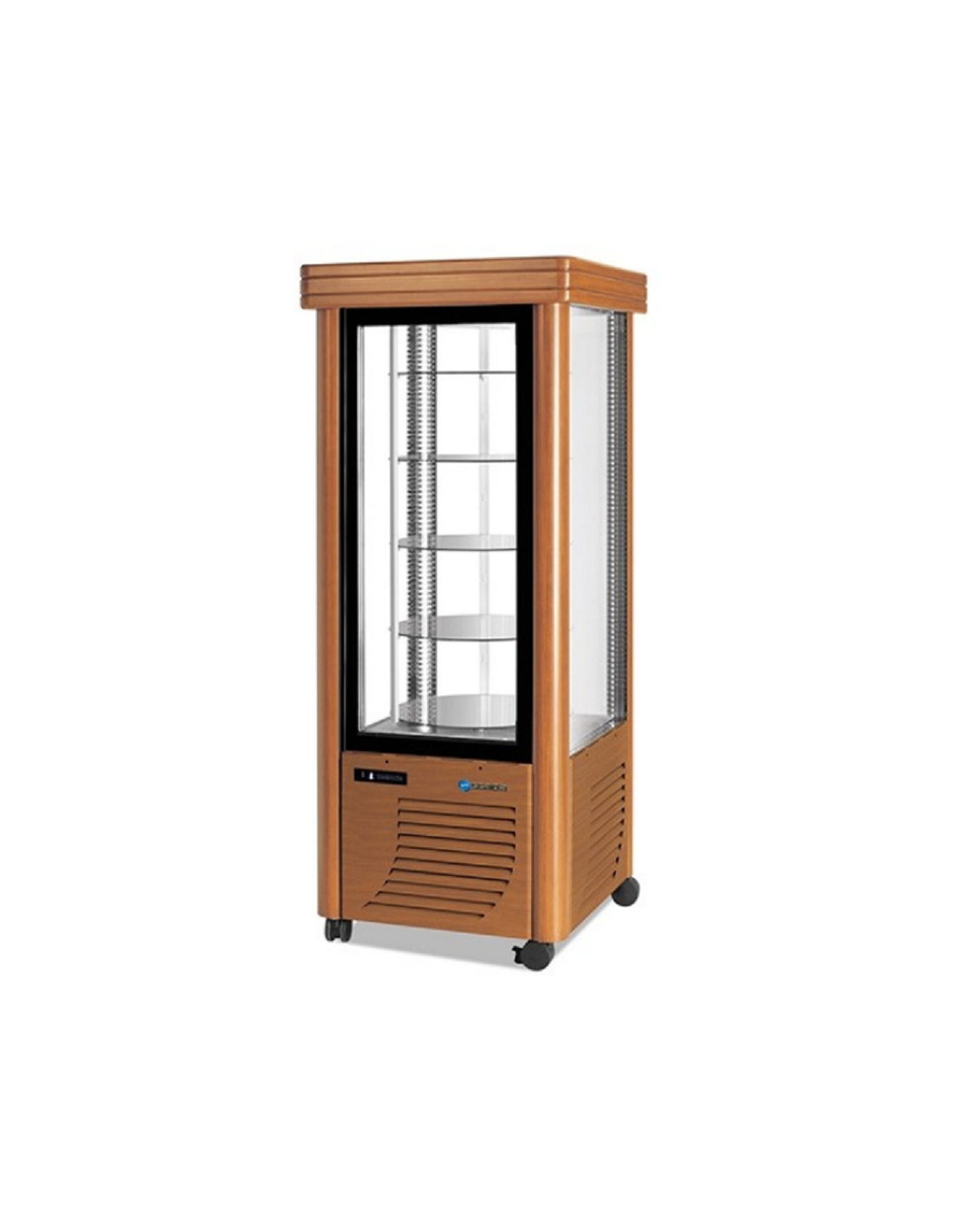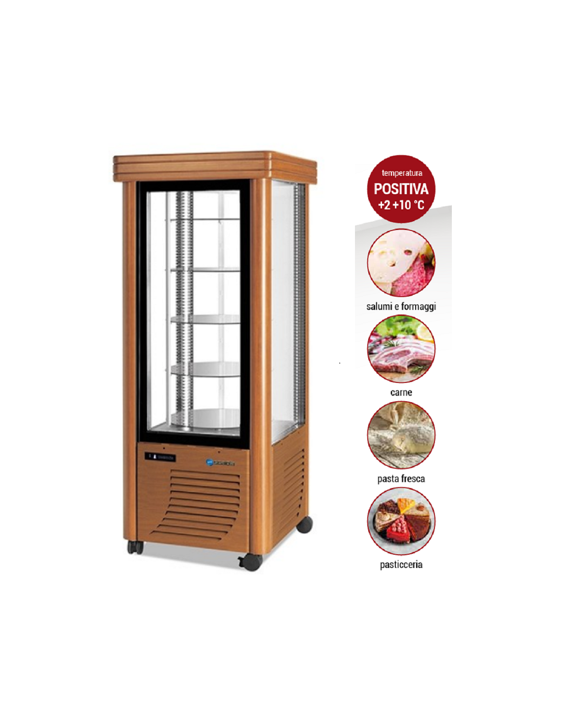 Refrigerated display case - Temperature +2 / +10 °C - Capacity Litres 400 - Circular shelves - 4-sided display - Ventilated refrigeration - LED lighting - Automatic defrost - Dimensions cm 75 x 75 x 186 h