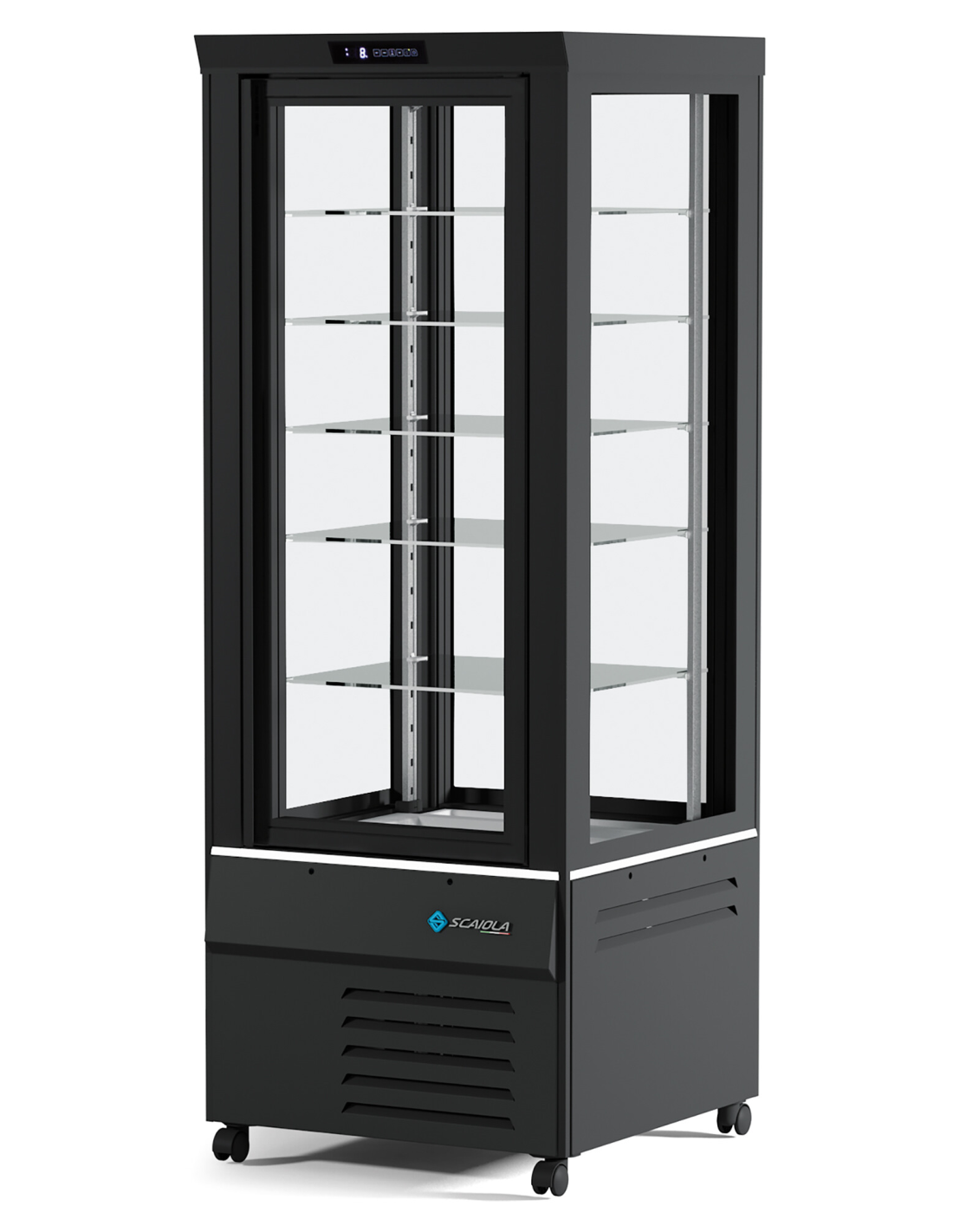 Pastry and ice cream display case with four glass sides - Temperature +2 +10 °C - Refrigeration Ventilated - Capacity 420 liters - N° 5 Shelves - LED lighting - Dimensions cm 69 x 72 x 187 h