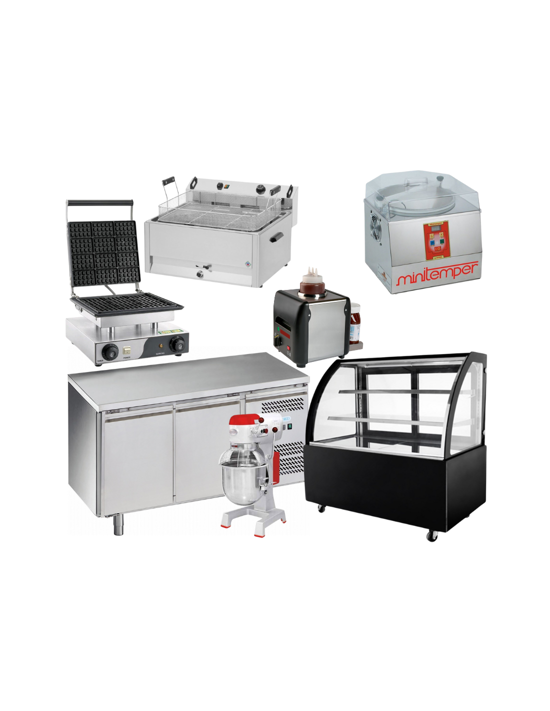 Pastry kit composed of: Single waffle plate + Chocolate bath + Refrigerated display case + Planetary kneader + Refrigerated table + Pastry fryer + Chocolate Temper
