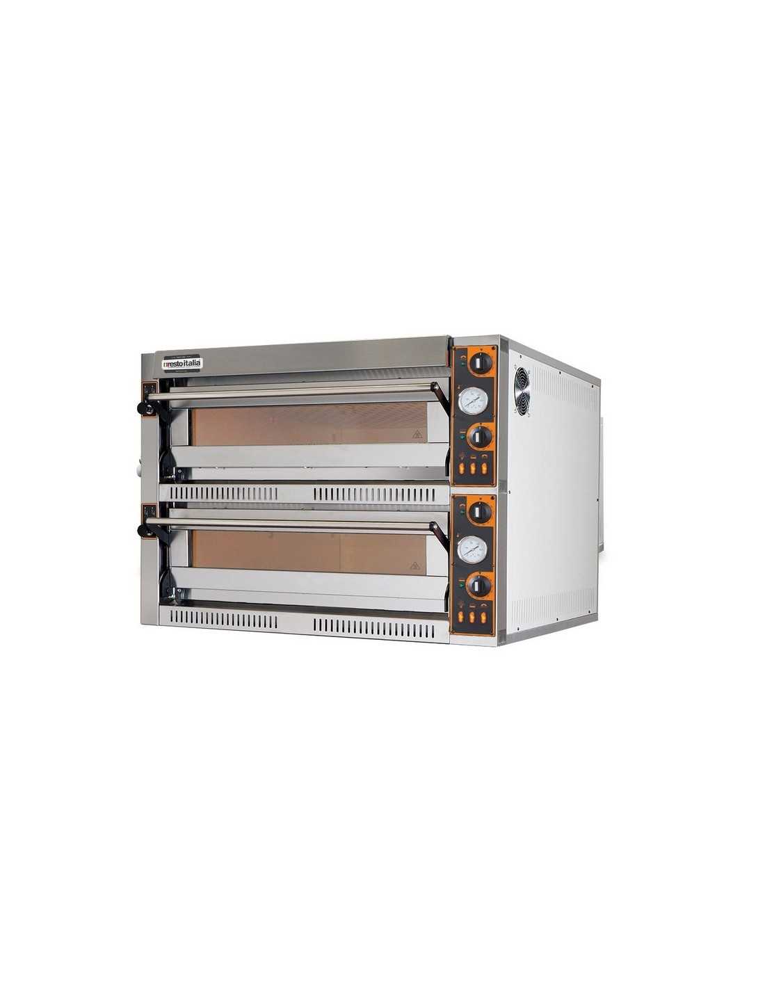 Electric pizza oven - Temperature 50 / 400 °C - Number of pans 1+1 (60X40cm) - Capacity pizzas n°4+4 - Pizza diameter 36 cm - Baking chambers n°1+1 - Dimensions chamber cm 72 x 72 x 14 h (x2) - Electromechanical control panel - Dimensions cm 95 x 90.5 x 71 h