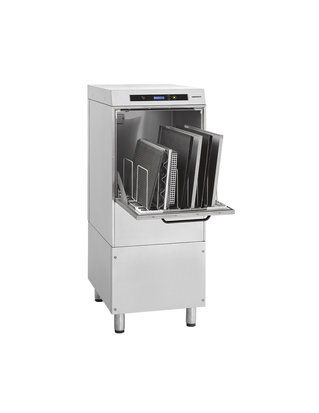 | Standard Equipment: n°2 dish baskets from cm 50x50 - Electronic Board - Stainless Steel Surface Filters - Stainless Steel Impellers - Peristaltic Detergent and Rinse Aid Dispenser - Temperature guaranteed rinse - Drain Pump |