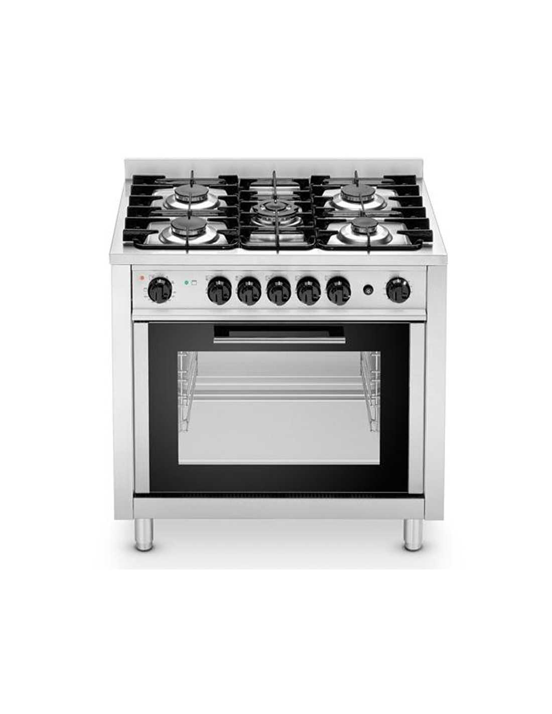 Stove n.5 burners - Electric convection oven - ModelEKC96 - Capacity n.4 pans/GN1 grills/1 - Monophase - Power oven kW2.9 - Hob kW14.3 - Dimensions cm 90 x 60 x 90 h