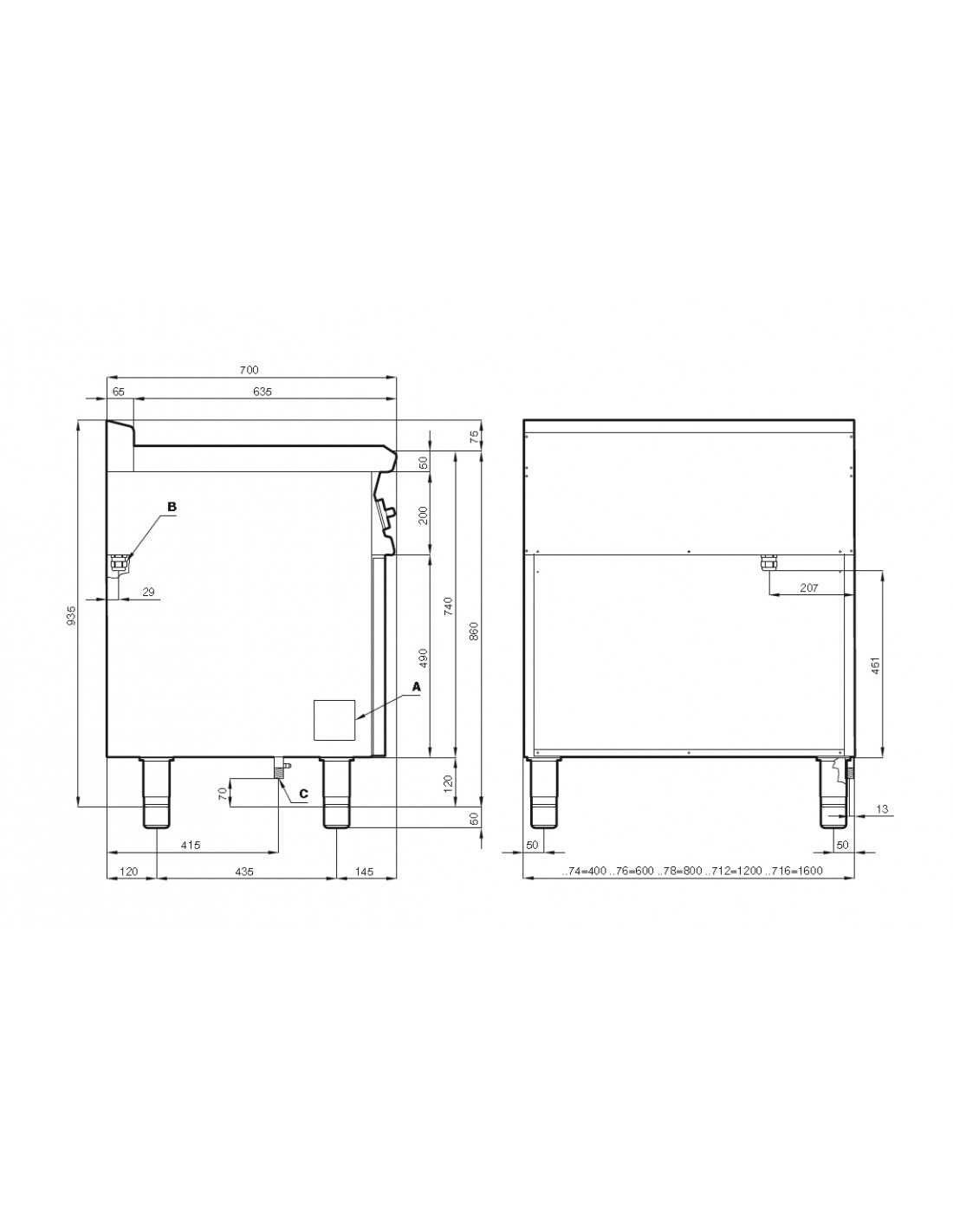Water cooker - Model PCA-74GP - No. 2 fires - Power 1 x 5.5 - 1 x 8.5 kW - kCal/h 12.040 - Water and venting tap - Open compartment - Gas supply - Dimensions cm 40 x 70,5 x 90 h