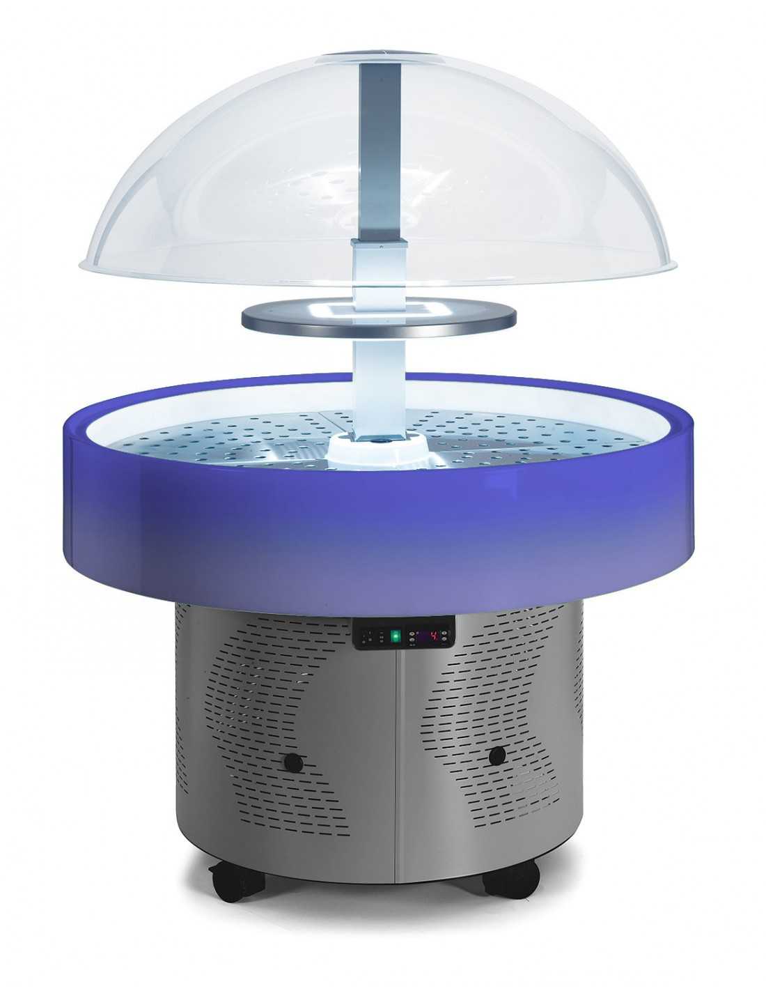 Opal-finish methacrylate basin, with ventilated refrigeration and operating temperature +3°C/ +10°C, the ISOLA Buffet is topped by a plexiglass dome hood with electric opening. | |