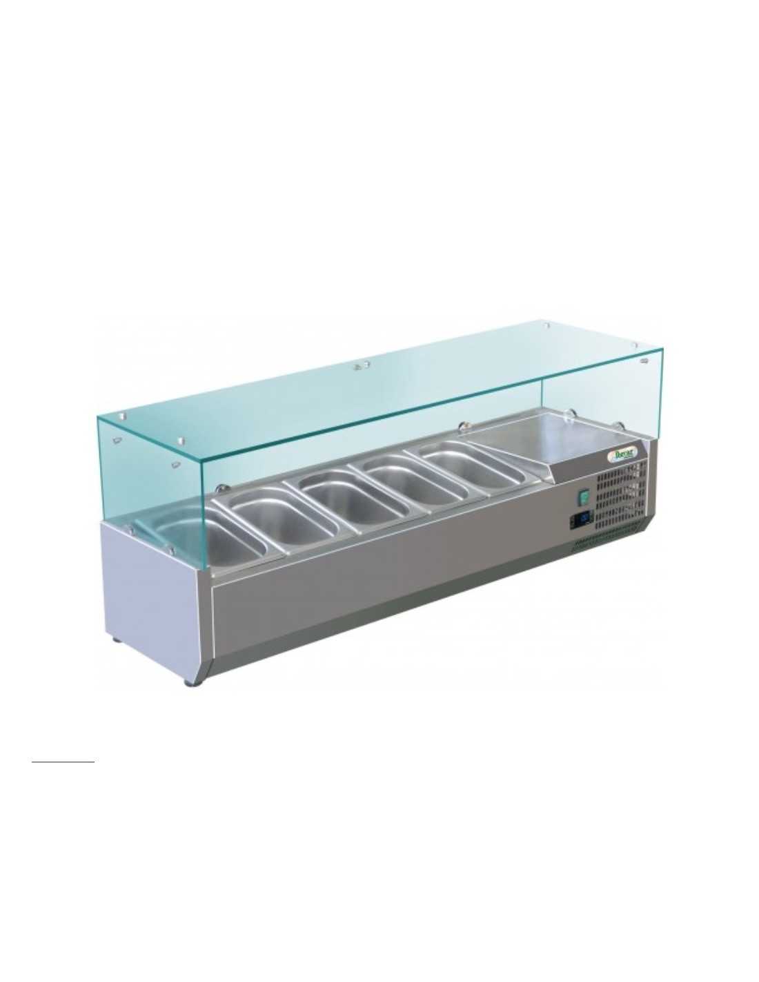Ingredient display case -Model RI12033V - stainless steel AISI 304 - Static - Capacity 5 bowls GN 1/4 - Power W 110 - With flat glass (can also be used without glass) - Temperature +2°/ +8°C - Dimensions with glass 120 x 33 x 44.5h - Dimensions without glass 120 x 33 x 24h