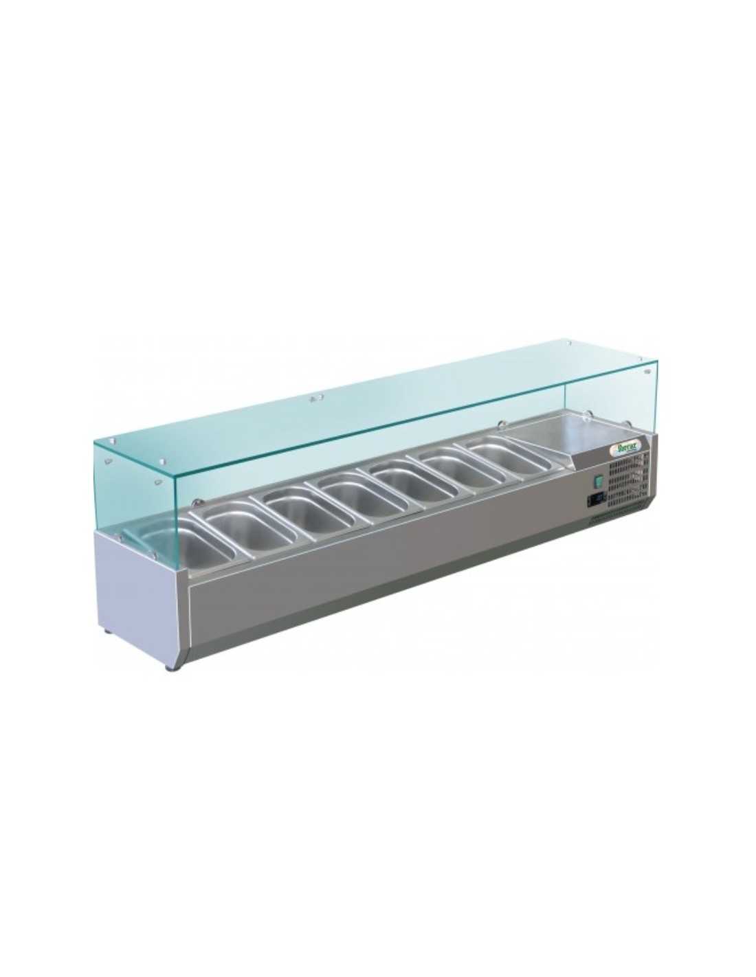 Ingredient display case - Model RI15033V - Acciaio inox AISI 304 - Static - Capacity 7 bowls GN 1/4 - Power W 110 - With flat glass (can also be used without glass) - Temperature +2°/ +8°C - Dimensions with glass 150 x 33 x 44.5h - Dimensions without glass 150 x 33 x 24h