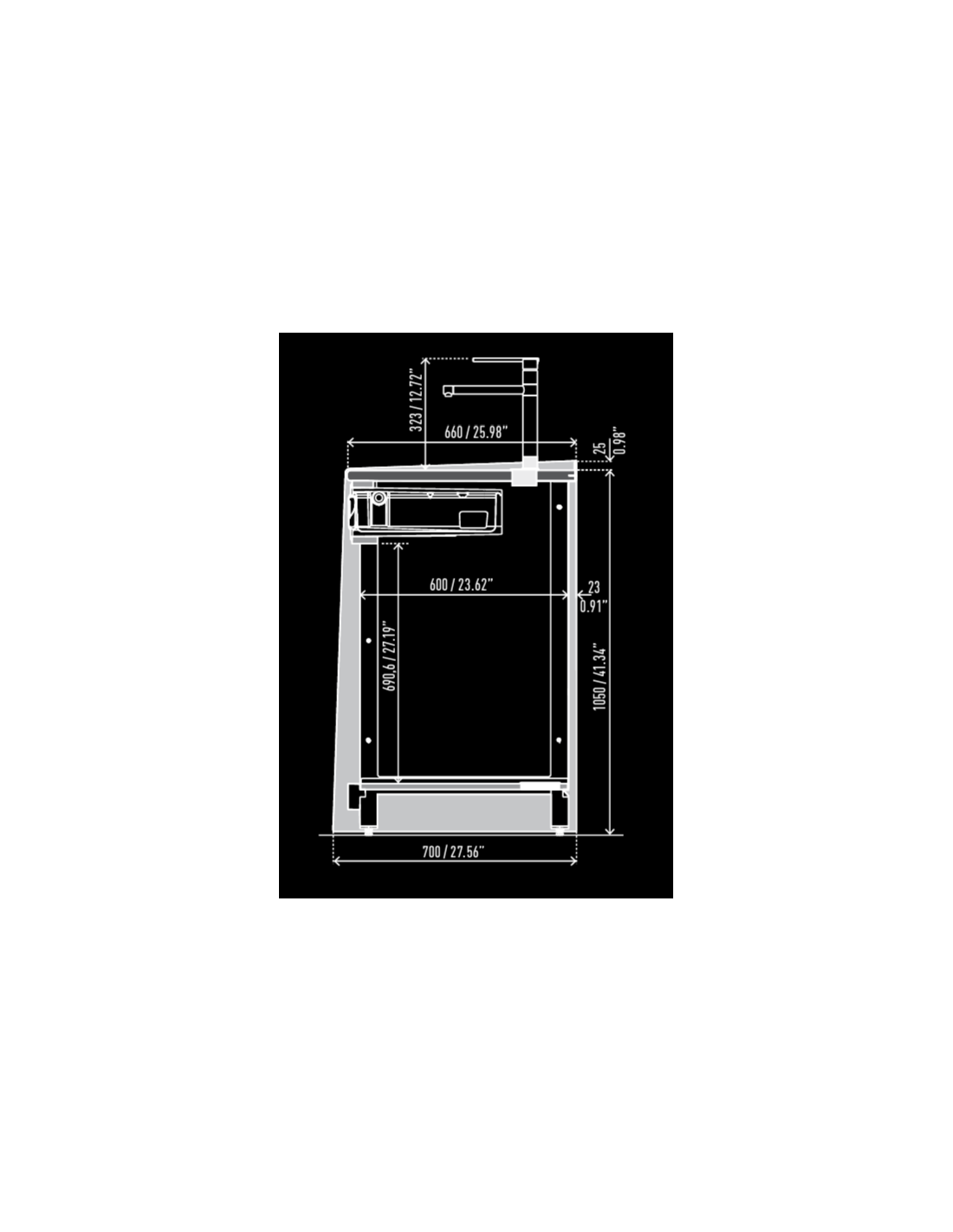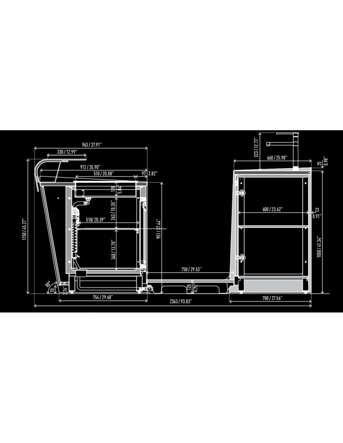 | REFRIGERATED TANK for the display of food & beverage recessed in the cell whose refrigeration it exploits, made of stainless steel with Scotch-Brite finish, available in 1000 and 1400 mm modules. The tank is equipped with drainage for cleaning and liquid evacuation. Temperature operating +4°C/ +8°C. Test at 25°C with 60% U.R. | |