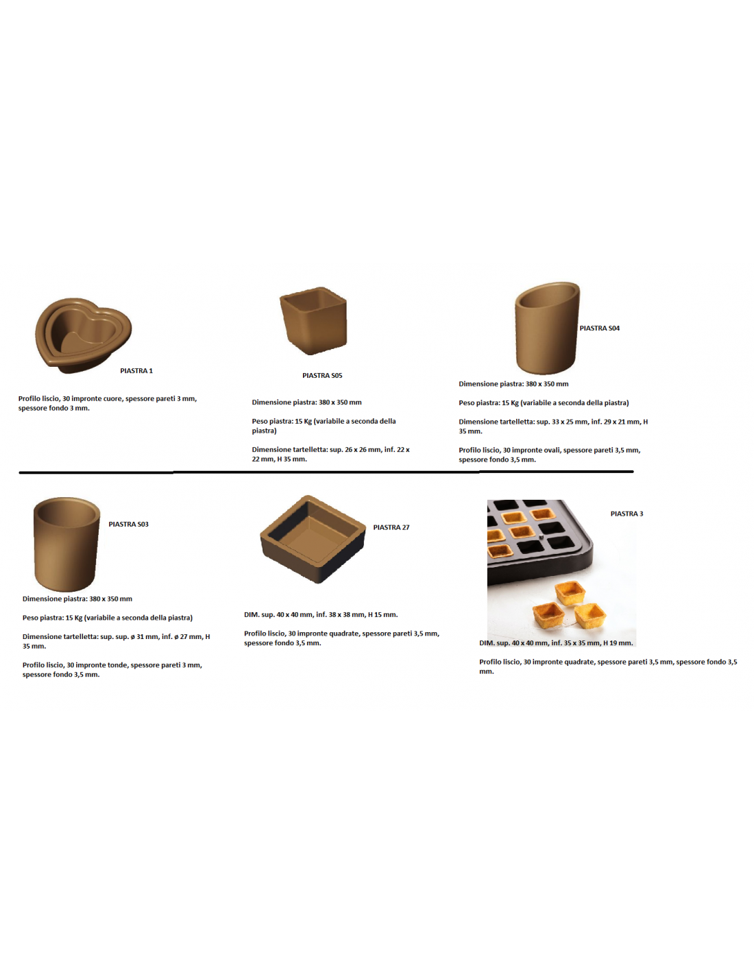 | Choose from the different pairs of plates available and make bases of various shapes for tartellette and sweet and salty paste: thanks to the perfect coupling of the two plates you will get always perfect tartellette for size and cooking | |