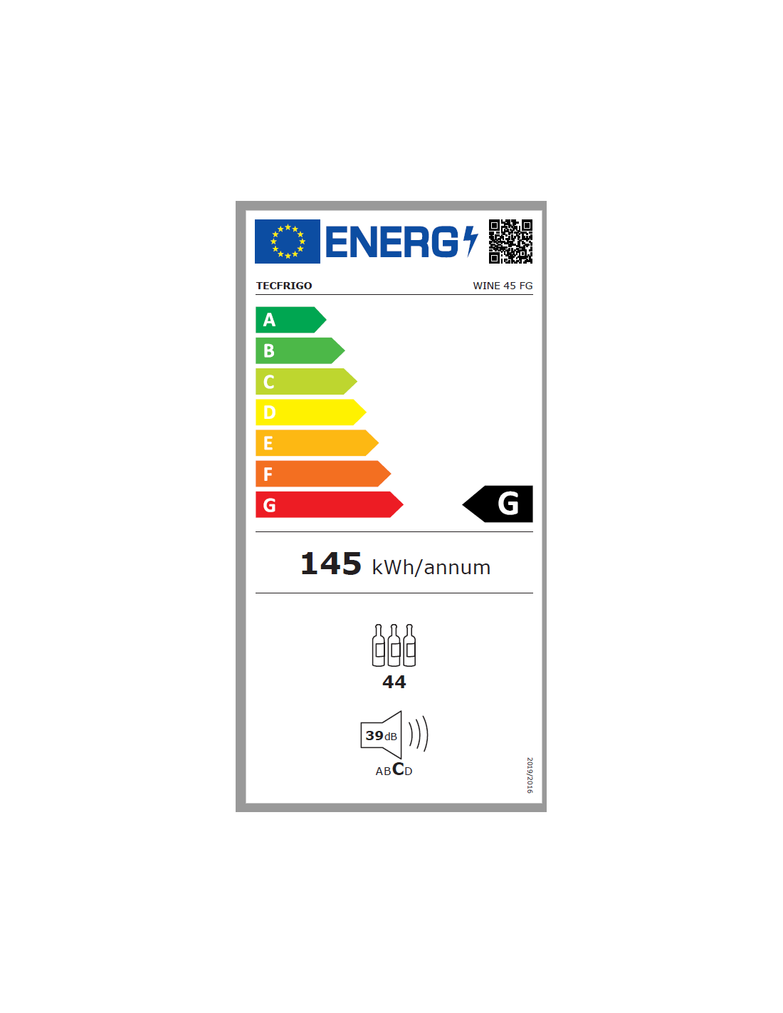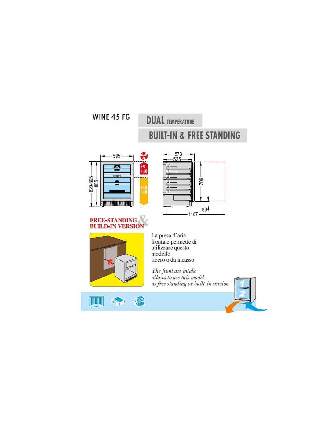Refrigerated wine display case - Mod. WINE45FG- Upper compartment temp. + 5 ° + 10 ° C - Lower compartment temp. + 10 ° / + 18 ° - Net capacity 145 liters - Capacity n. 45 bottles of 0.75 lt - Ventilated - Automatic defrost at pause - Power W 125 - Energy class B - Dimensions 59.5 x 57.3 x 82 / 89.5 h cm