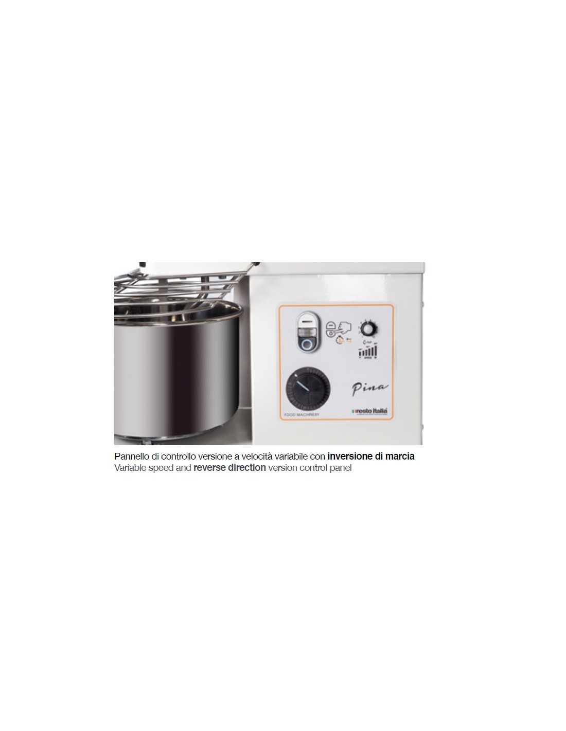 Mezclador espiral con cabezal fijo - Modelo PINA10MOVV - Capacidad depósito litros 7 - Peso masa kg 6 - Velocidad variable - Alimentación monofásica - Dimensiones cm 26 x 54 x39 h