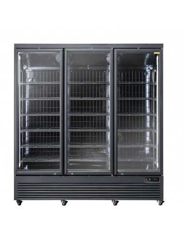 Armario congelador - ModeloRFG1900B - Temperatura -22°/ -18°C - Capacidad litros 1450 - Puerta de cristal - Acero pintado de negro para exterior e interior - 18 estantes - Refrigeración ventilada - Energía W 2198 - Dimensiones cm 188 x 76 x 203 h