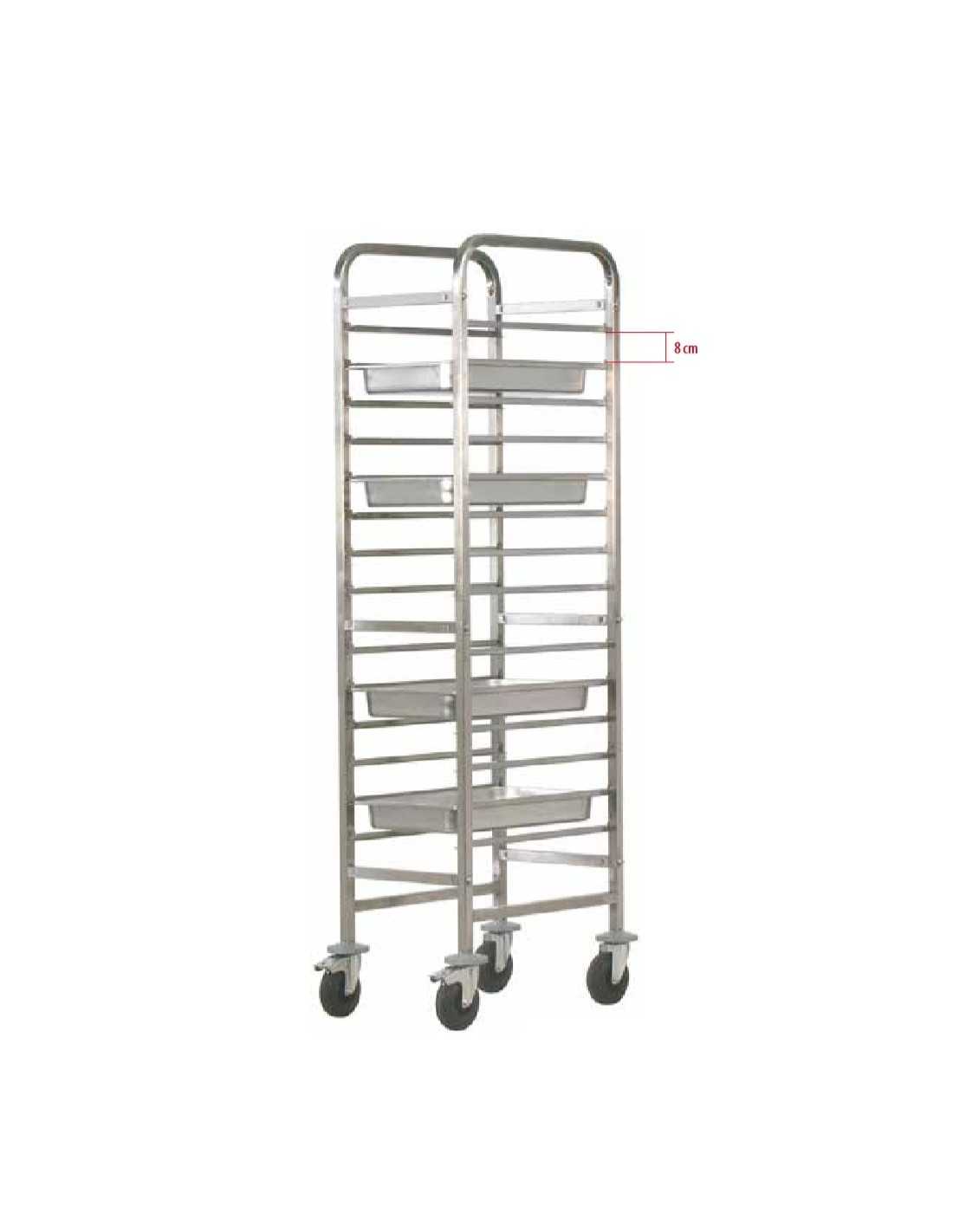 Carros reforzados para bandejas GN - Modelo CA1489R - Bastidor tubular de acero inoxidable 25 x 25 - Guías de acero inoxidable - Topes de goma - Ruedas multidireccionales - Bandejas excluidas - Capacidad 14 bandejas GN1/1- Dimensiones cm 45,5 x 62 x 177h