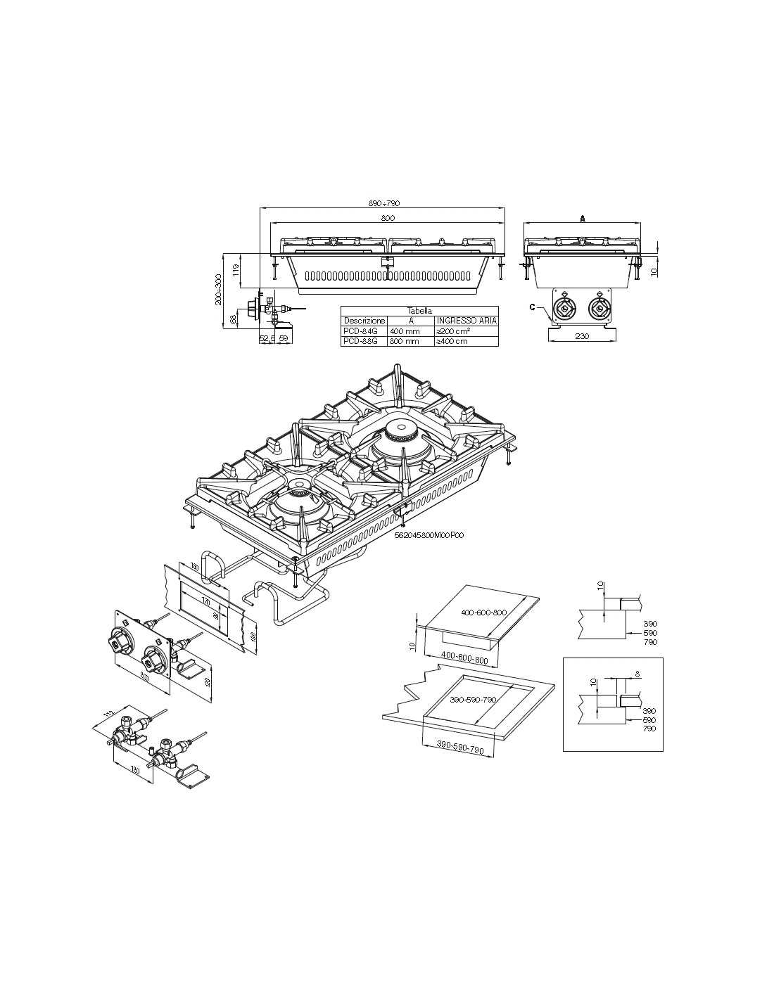 Placa de gas - Modelo PCD-84G - N. 2 quemadores - Parrilla de hierro fundido - Bandeja de goteo extraíble - Alimentación gas - Energía kW 11 - kCal 9.460 - Dimensiones cm 40 x 80 x 11 h