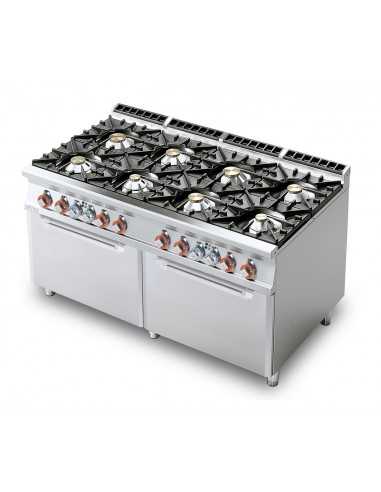 Cocina de gas - Modelo CF8-916G - N. 8 quemadores - N. 2 hornos estáticos GN 2/1 - Energía total Kw 73 - Estructura de acero inoxidable - Dimensiones cm 160 x 90 h