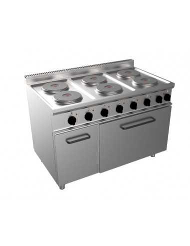 Cocina eléctrica - Modelo E7CUET6LE - N. 6 placas redondas Ø 22 - Bastidor de acero inoxidable - Horno eléctrico estático cm 54,5 x 53 x 35 h - Energía kW 21,6 - Dimensiones cm 120 x 70 x 85 h