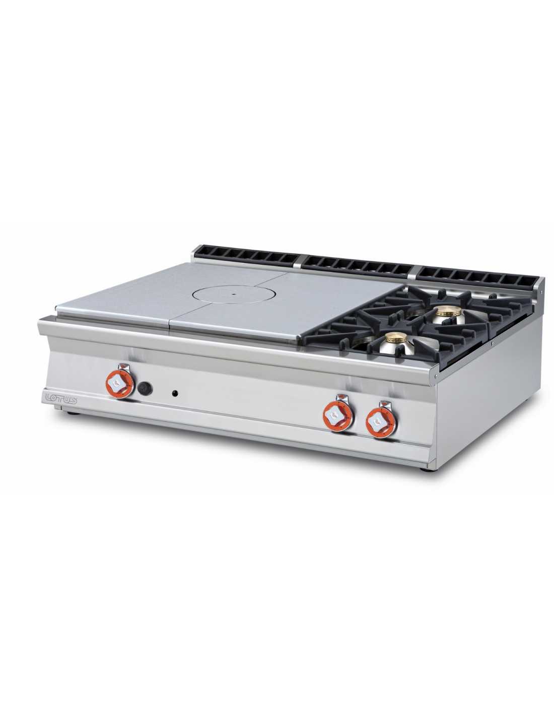 Cocina de gas - ModeloTP2T-912G - N. 2 quemadores + Placa completa - Construcción de acero inoxidable - Energía total kW 29 - Dimensiones cm 120 x 90 x 28 h