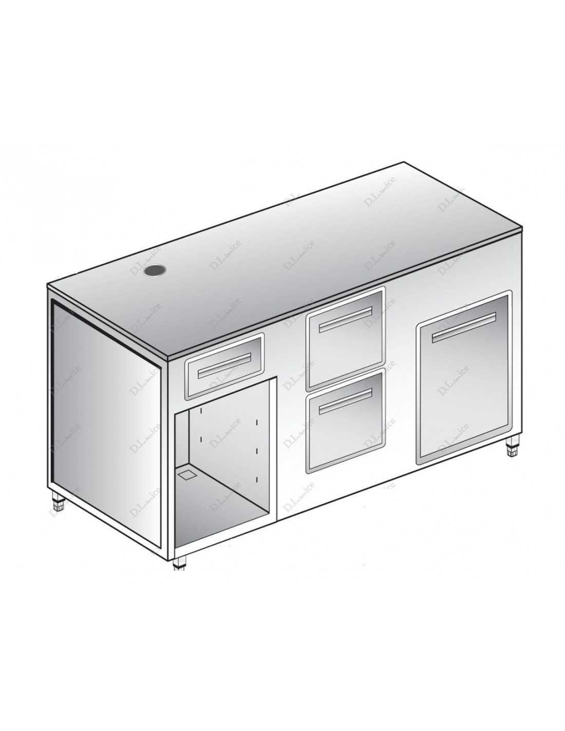 NMostrador para máquina de café - Modelo BMC155355-3000 - Bastidor de acero inoxidable 18/10 AISI 304 - N. 1 cajón neutro - N. 1 tolva para batidor de café - N. 1 tolva para residuos - Compartimento inferior abierto - Dimensiones cm 150 x 55 x 90 h