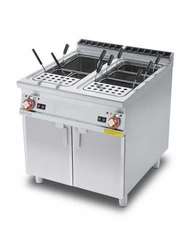 Cocedor de pasta eléctrico - ModeloCPA-98ET - N. 2 depósitos litros 40 + 40 - Estructura de acero inoxidable - Energía total kW 27 - Llenado automático de agua - Sensor de nivel de rebosamiento -Trifasico - Dimensiones cm 80 x 90 h