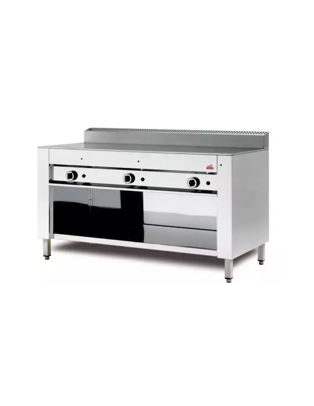 Cocina de gas 10 piadinas con compartimento abierto - Modelo CP10-V - Dimensiones placa de cocción cm 150 x 60 x 33 h - Capacidad calorífica 16,5 Kw - Dimensiones cm 151 x 73 x 96 h