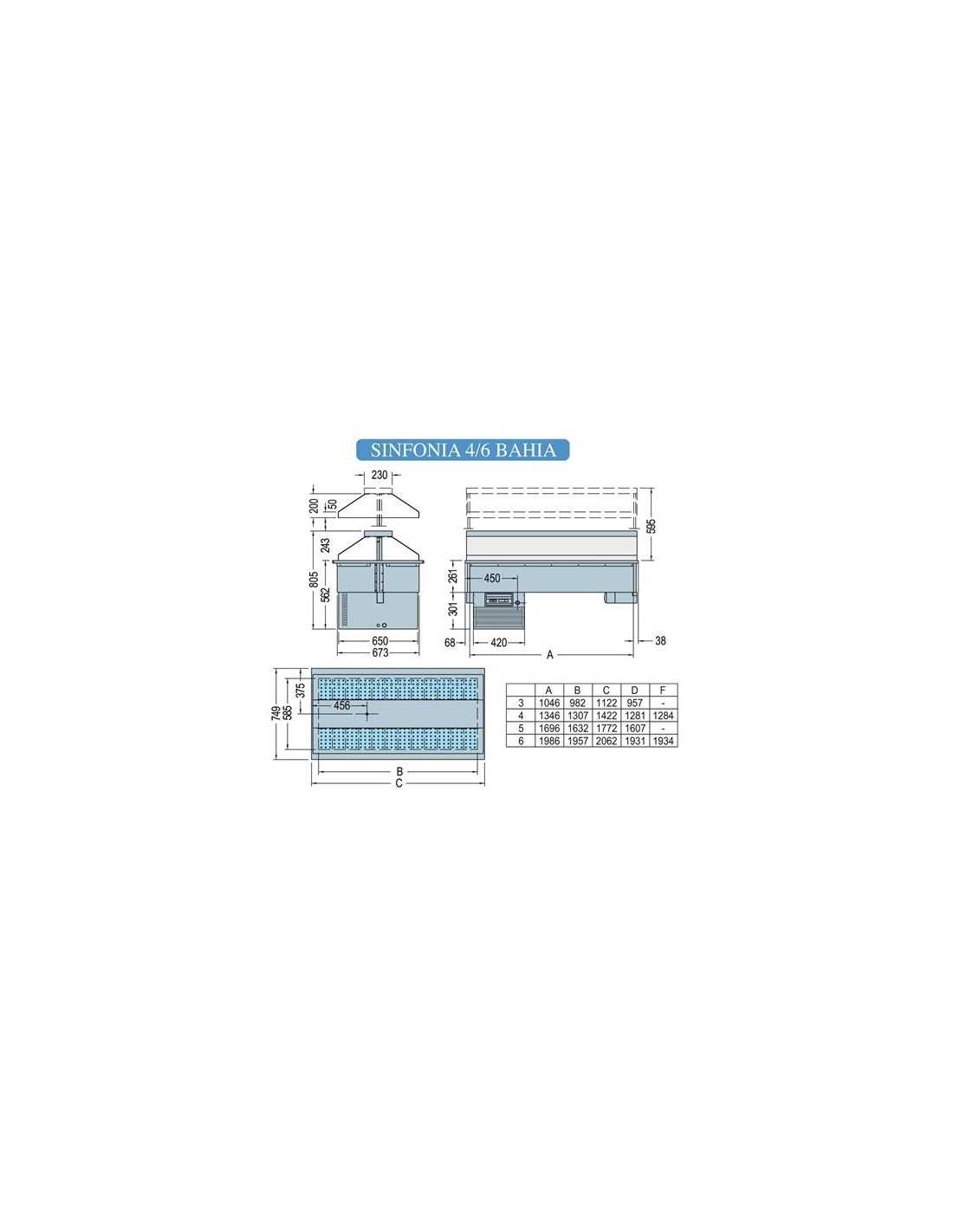 Cubeta expositora refrigerada empotrable para pescado - Modelo SINFONIA BAHIA - Energía 400W - Dimensiones cubeta cm 193 x 58 x 11H - Temperatura -2/0 °C - Alimentación monofásica V230/1/50Hz - Tamaño cm 206.2 x 74.9 x 115.7H - peso Kg 117