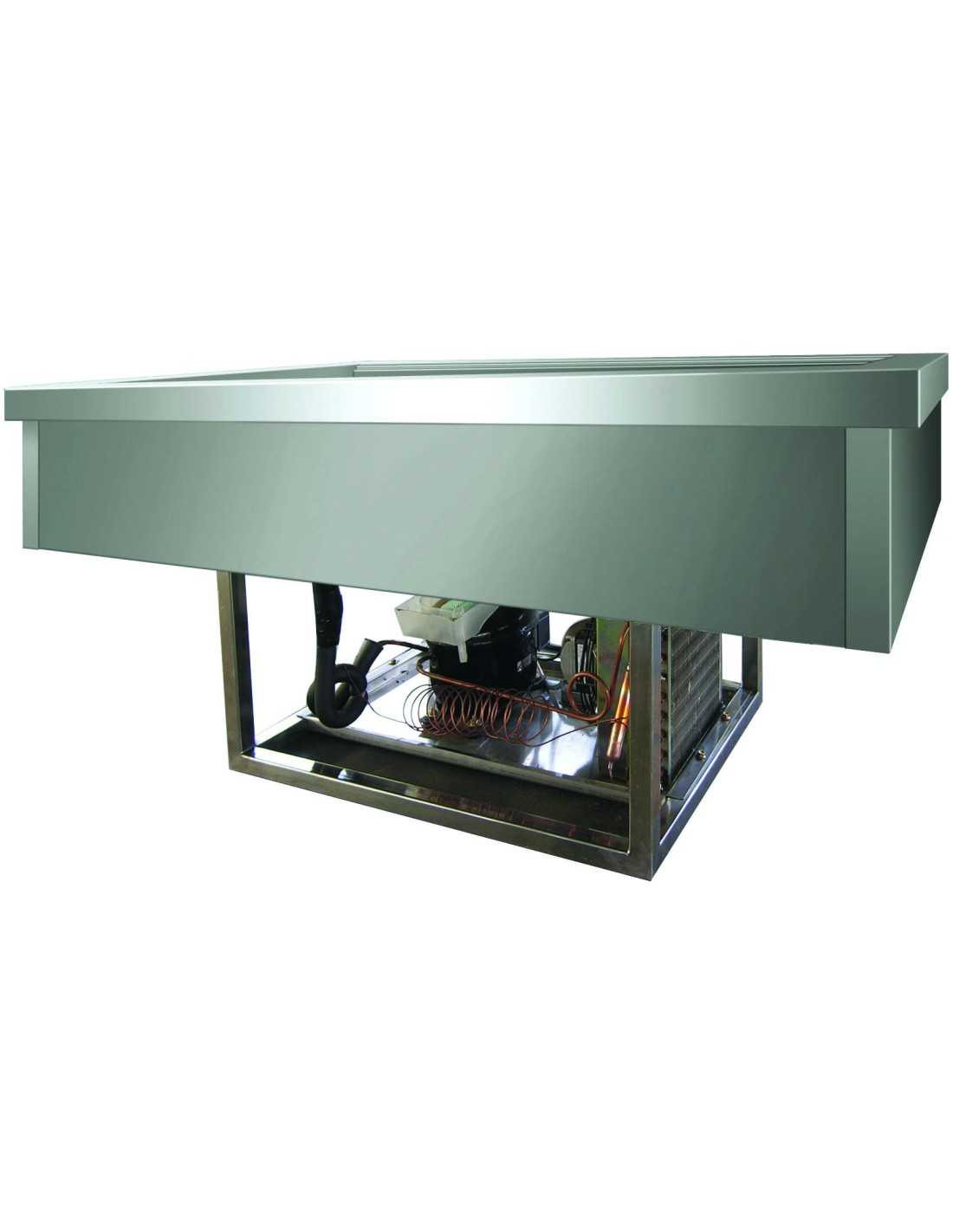 Bañera Refrigerada - Modelo VRI411F - Acciaio inox AISI 304 - Empotrable - Temperatura -5/+5 °C - Espesor de aislamiento 50 mm - Refrigeración Estática - Unidad empotrable en el compartimento inferior - Control electrónico de la temperatura con termostato digital - Descongelación automática - Evaporación automática del agua de condensación - Energía W 340 - Alimentación monofásico 220/240V-50Hz - N° 4 x GN1/1 cm 15h - Dimensiones cm 144 x 68 x 54.5 h