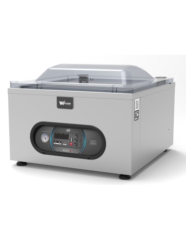 Cámara de vacío - Modelo ST-500 - Sobremesa - Bomba de vacío 25 m3/h - Tolva en plexiglás transparente - Barra de sellado 510 mm - Alimentación monofásica - Energía 1500 W - Tamaño del depósito cm 51,5 x 55 x 22h - Tamaño total cm 60 x 67 x 46h