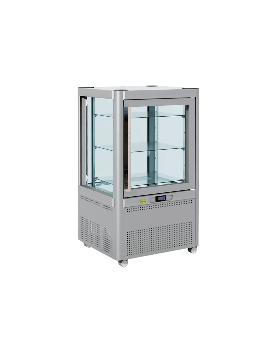 Vitrina para Pastelería y Heladería - Modelo: PRISMA201-TNV-PF - Temperatura +4°C / +10°C - Capacidad lt .200 - Refrigeración Ventilada - Pausa Automática de Descongelación - N° 3 Estantes en Rejilla cm 50,5 x 43,5 - Monofásico - Dimensiones cm 68 x 69 x 119,5 h