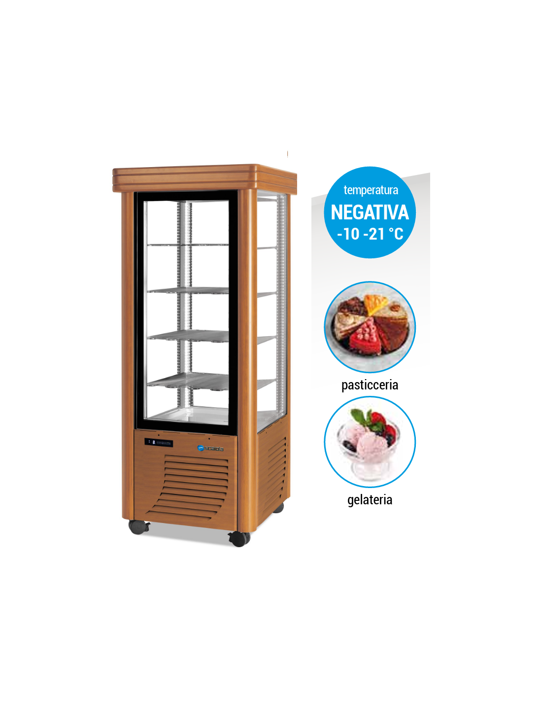 Vitrina para pastelería y heladería - Temperatura -5 / -20 °C - Capacidad Litros 400 - Expositor de 4 caras - Refrigeración estática - Descongelación automática - Iluminación LED - Dimensiones cm 75 x 75 x 186 h
