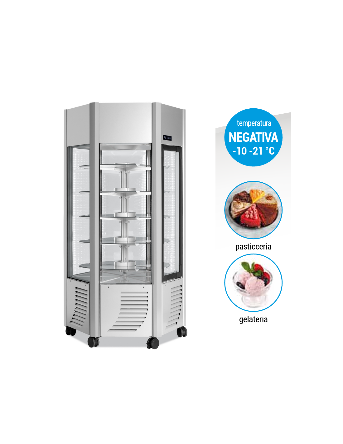 Vitrina de pastelería y heladería - Temperatura +5 / -21°C - Capacidad Litros 600 - Exposición en todos los lados - Refrigeración ventilada - Iluminación LED - Dimensiones cm 101 x 90 x 190 h