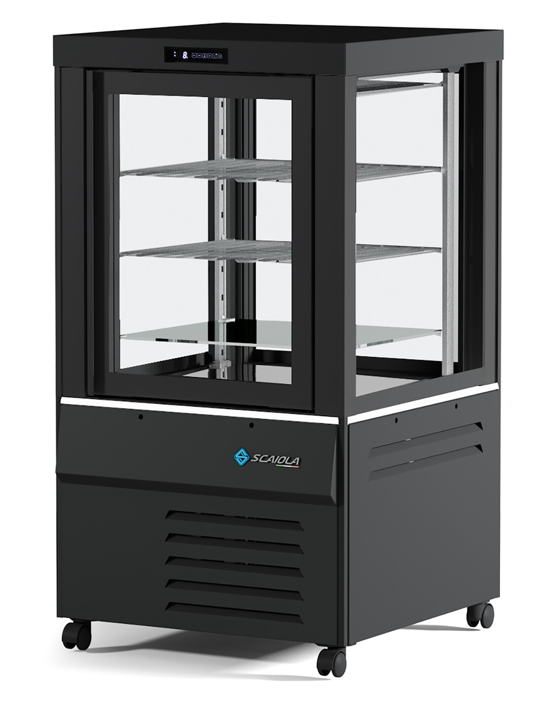 Vitrina para pastelería y heladería con cuatro lados de cristal - Temperatura -10 -21 °C - Refrigeración Estático - Capacidad litros 230 - N° 2 Estantes - Iluminación LED - Dimensiones cm 69 x 72 x 128 h