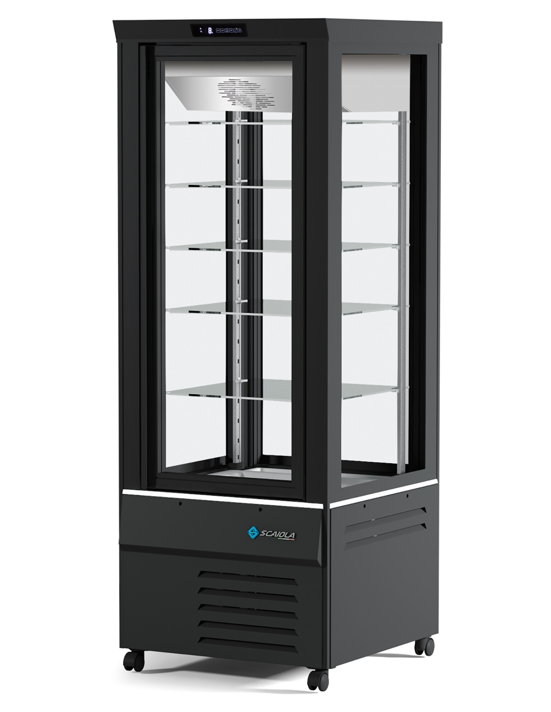 Vitrina de pastelería y heladería con cuatro lados de cristal - Temperatura +5 -21 °C - Refrigeración Ventilado - Capacidad 400 litros - N° 5 Estantes - Iluminación LED - Dimensiones cm 69 x 72 x 187 h