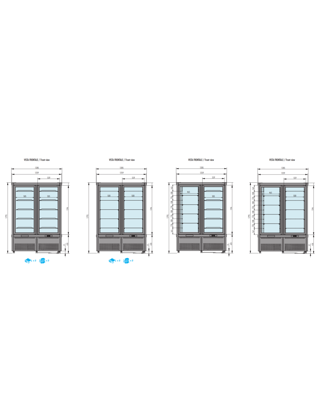 | Acristalamiento triple con doble acristalamiento estándar, a cada lado, para las versiones Refrigeradas, de lo contrario las versiones negativas están equipadas con triple acristalamiento doble de baja emisividad con Gas Argón | |
