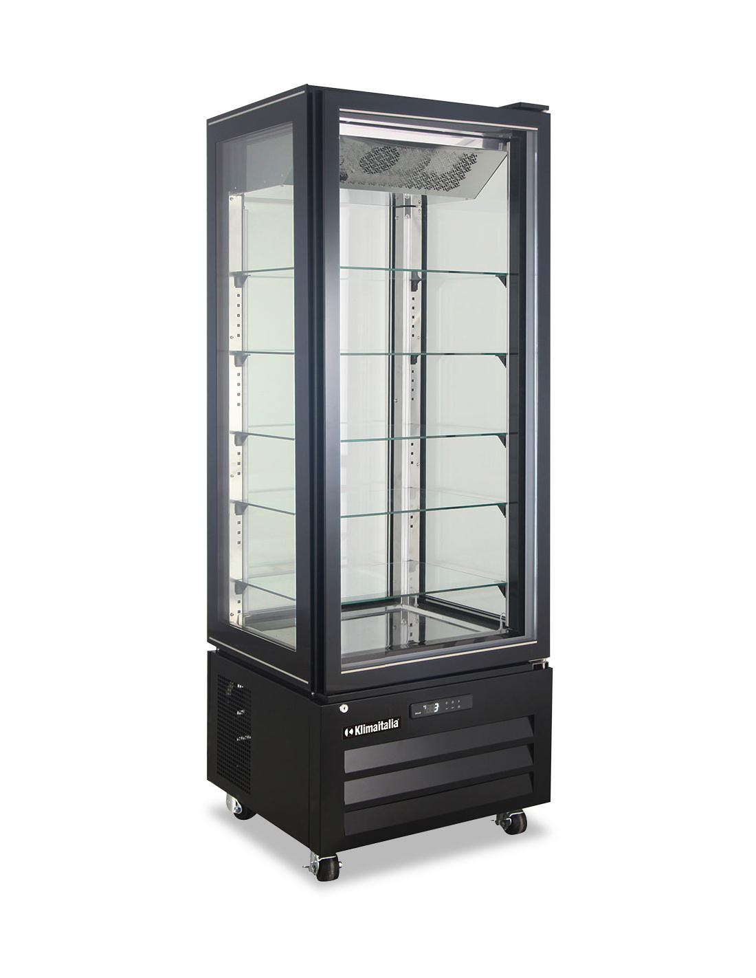 Vitrina de pastelería - Modelo VICTORIA65NFN - Temperatura -18°/ -22°C - Capacidad litros 340 - N. 4 laterales de cristal - Refrigeración ventilada - N. 5 estantes de cristal - Energía W 1000 - Dimensiones cm 65 x 59,5 x 195 h