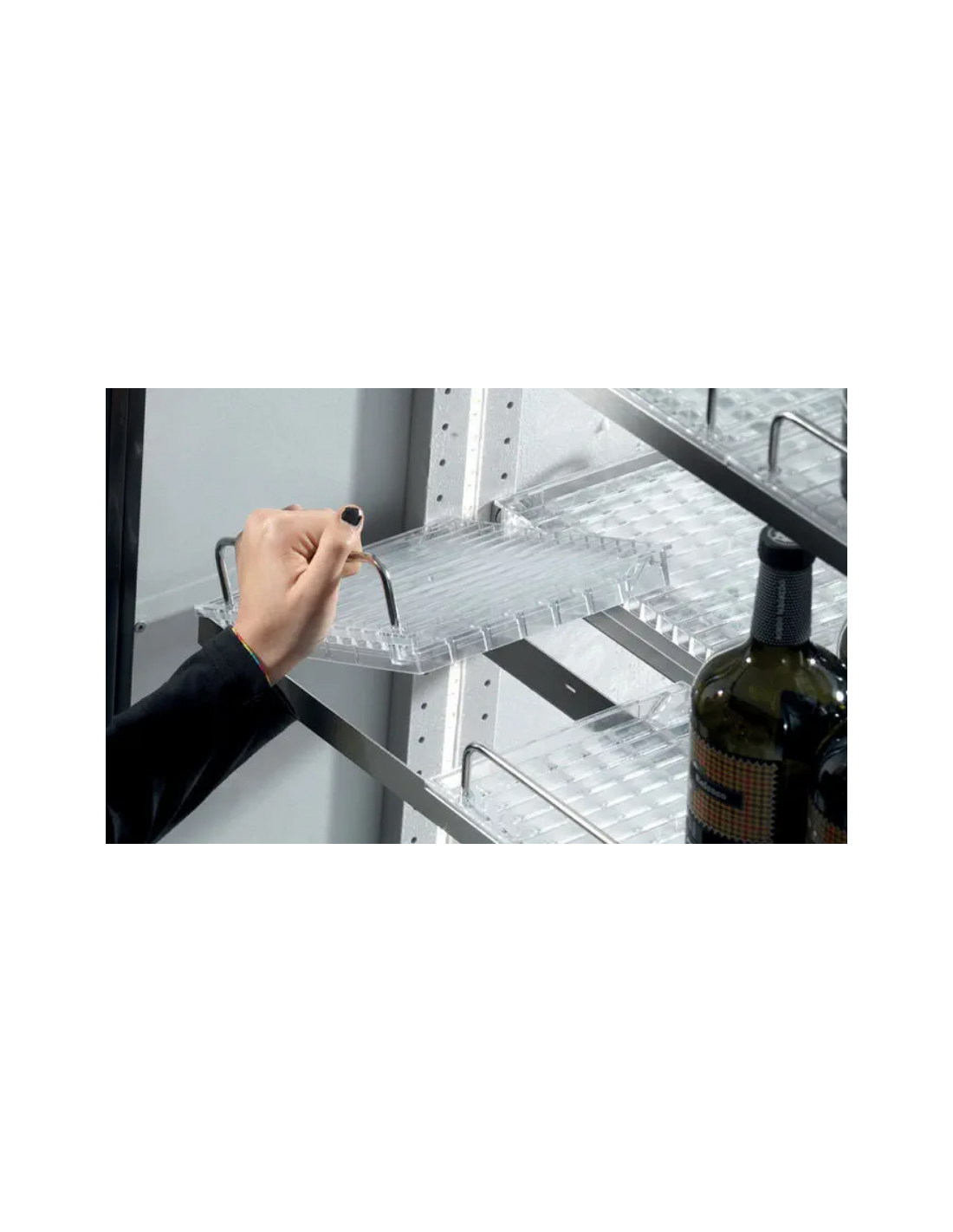 | I las baldas también ofrecen una gran libertad de acción dentro de los módulos individuales: las baldas de cuarzo y acero inoxidable pueden reclinarse en dos posiciones (a 90° y 112°), y las baldas de policarbonato y acero inoxidable también pueden colocarse a diferentes alturas, simplemente moviendo los tornillos de la barra central. Fácilmente desmontables, las baldas también pueden lavarse en el lavavajillas. | |