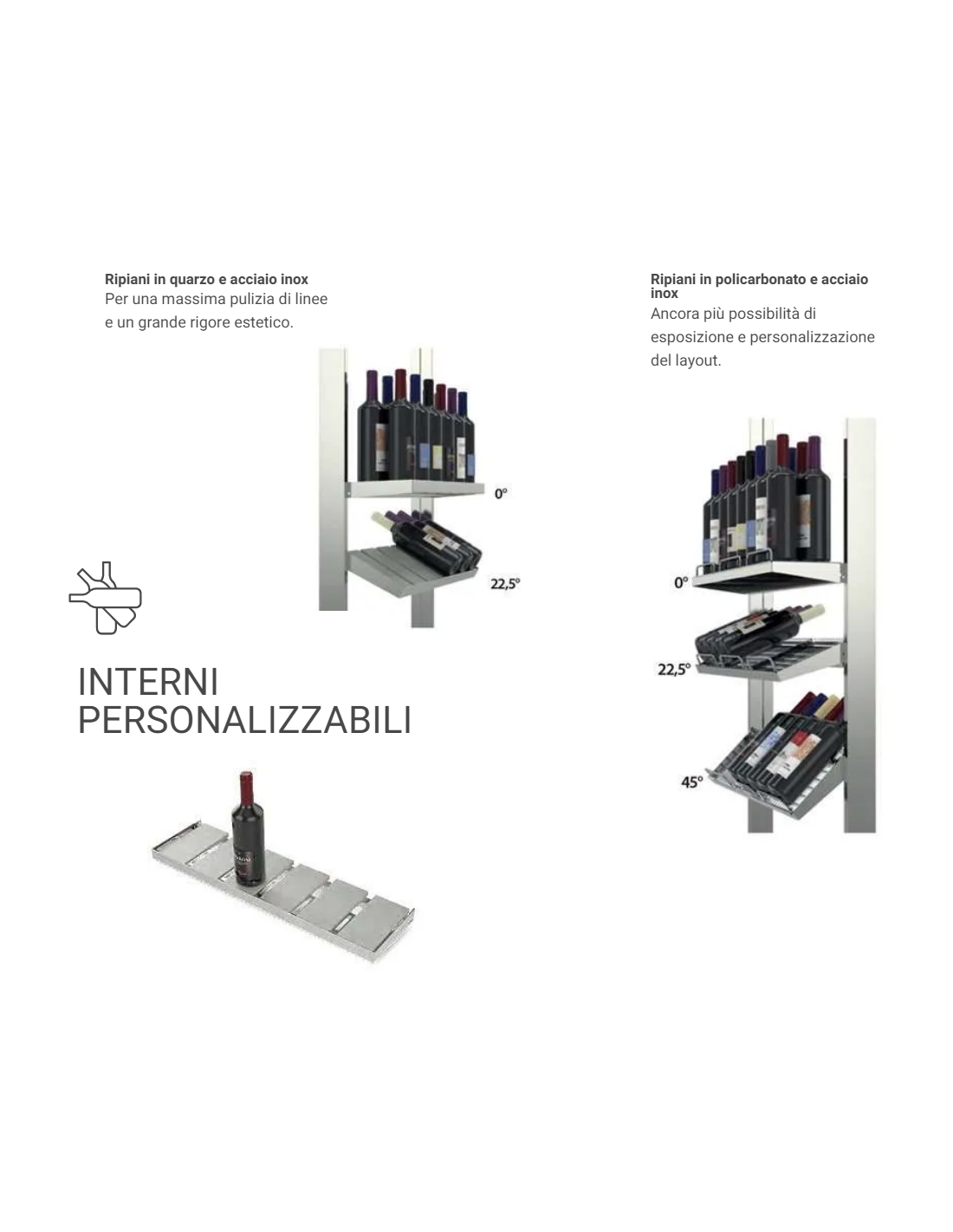 | I las baldas también ofrecen una gran libertad de acción dentro de los módulos individuales: las baldas de cuarzo y acero inoxidable pueden reclinarse en dos posiciones (a 90° y 112°), y las baldas de policarbonato y acero inoxidable también pueden colocarse a diferentes alturas, simplemente moviendo los tornillos de la barra central. Fácilmente desmontables, las baldas también pueden lavarse en el lavavajillas. | |