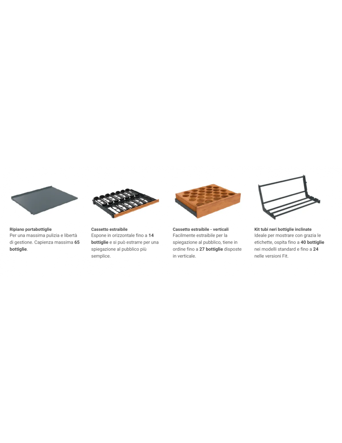 | Capacidad botellas | aprox. 24 balda fija - aprox. 27 cajón extraíble vertical - aprox. 5 cajón extraíble - kit de tubos aprox. 18 |