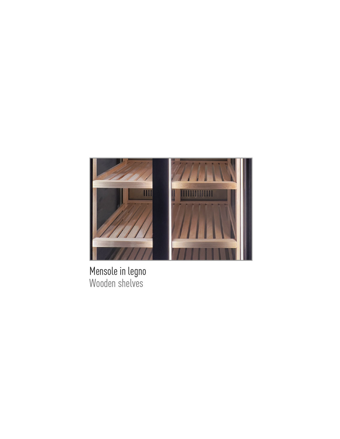 Frigorífico para vinos - Temperatura +3°+20°C - Capacidad litros 695 - N. 2 puertas - N. 5 estantes de madera - Iluminación Led - Energía W 800 - Cm 90 x 58.2 x 230.5 h